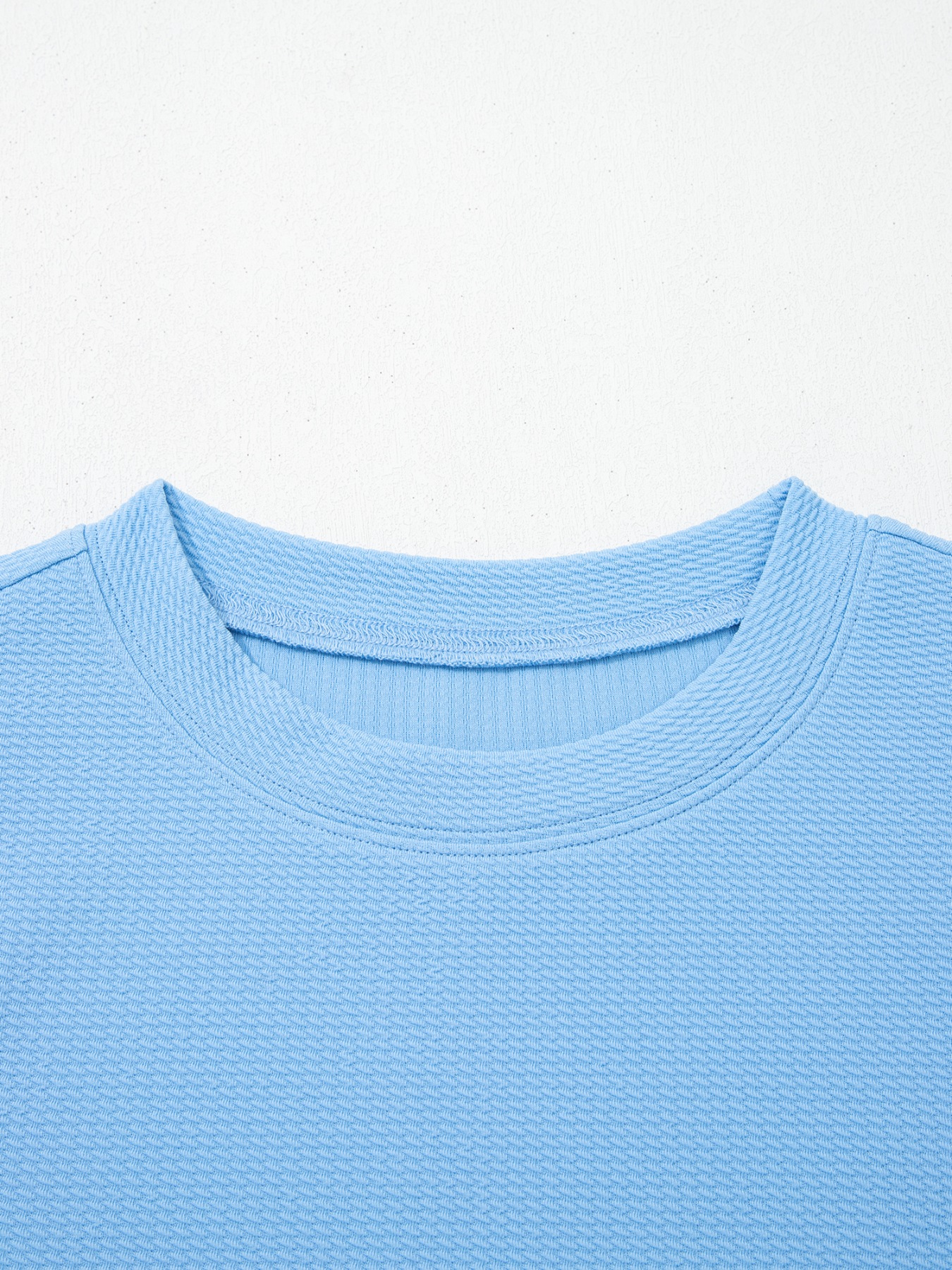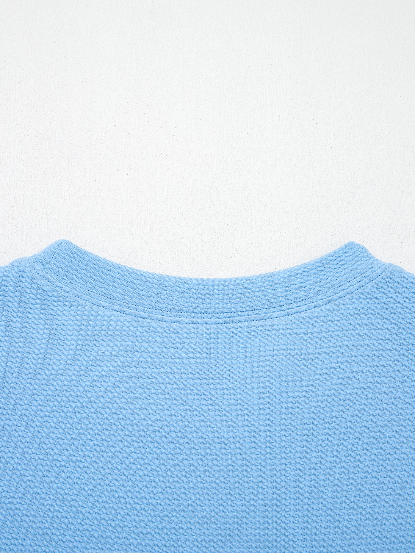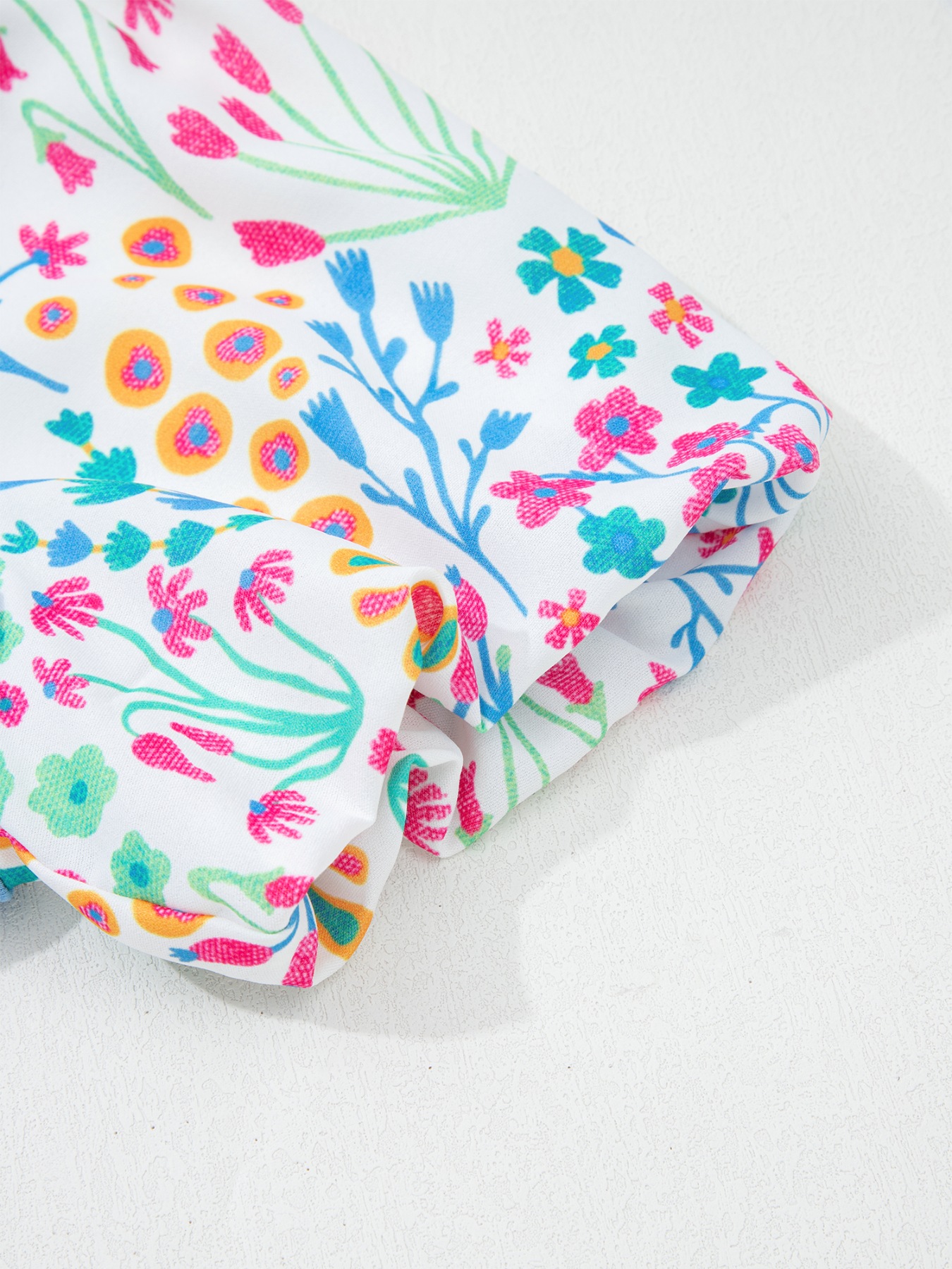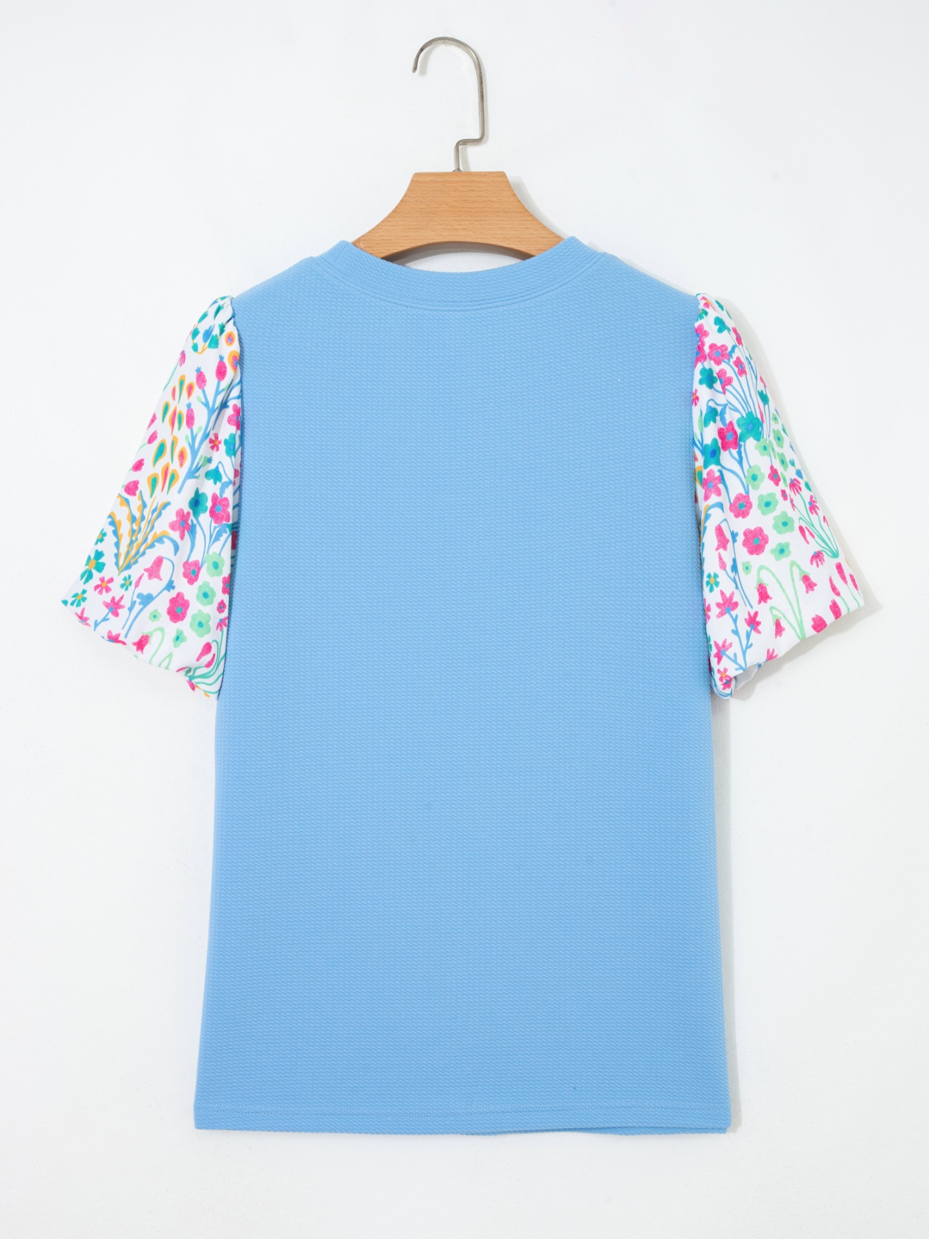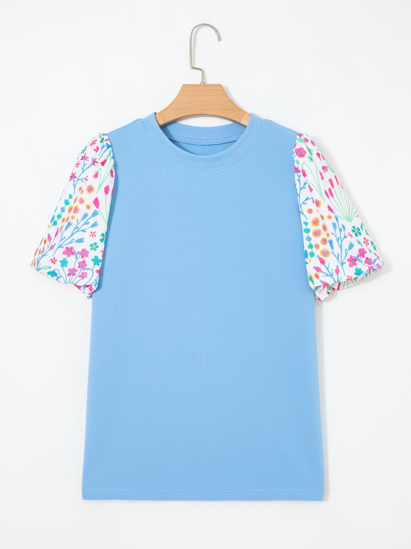 Round Neck Textured Contrast Floral Bubble Sleeve Blouse