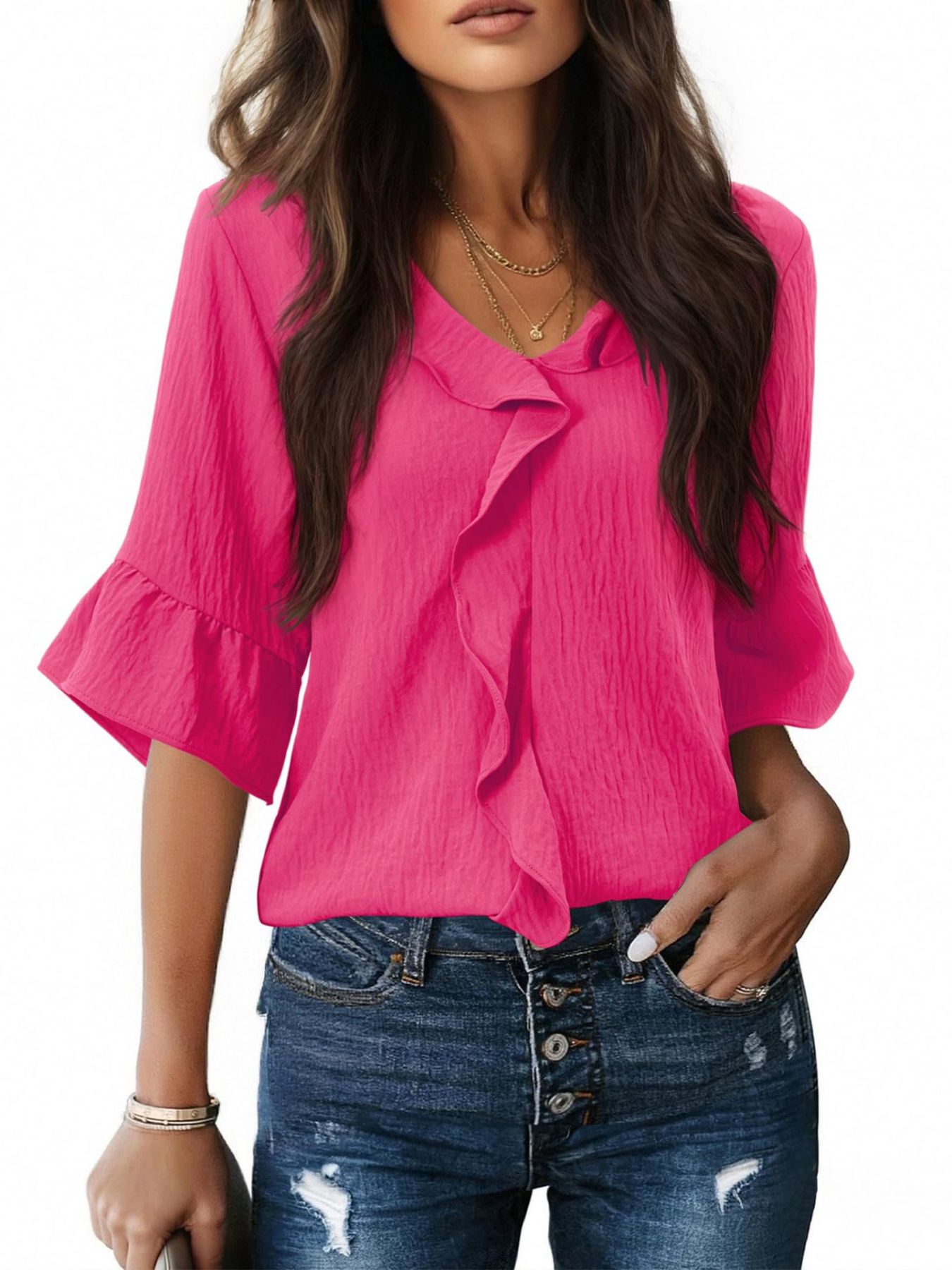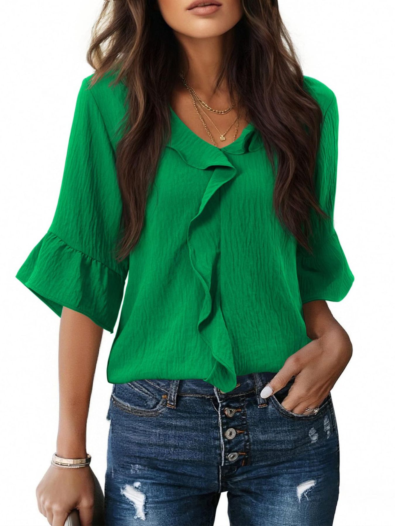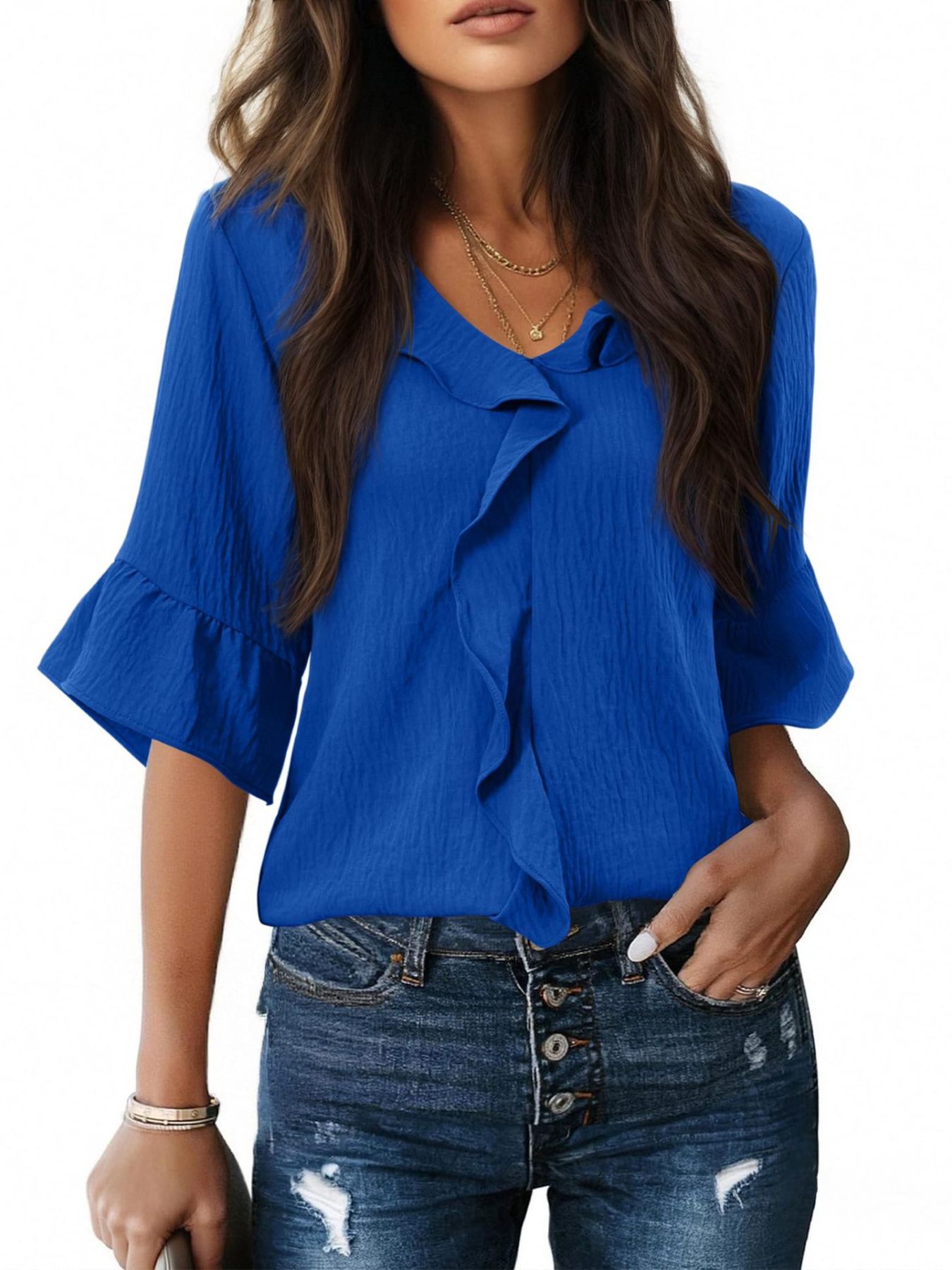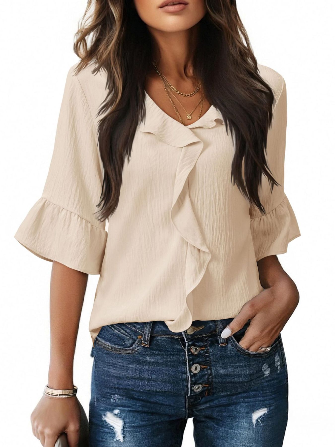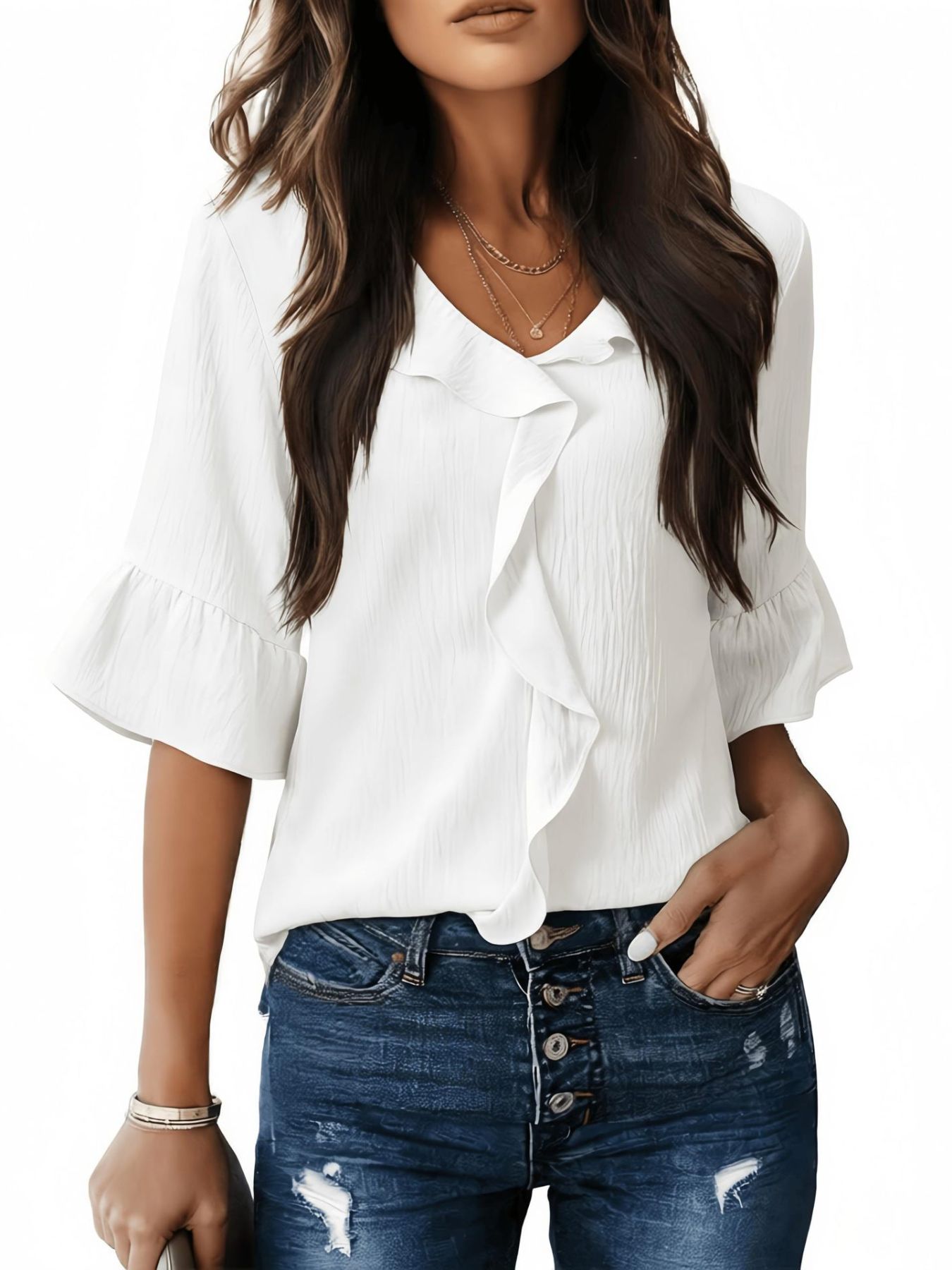 Ruffle V-Neck Flounce Sleeve Blouse