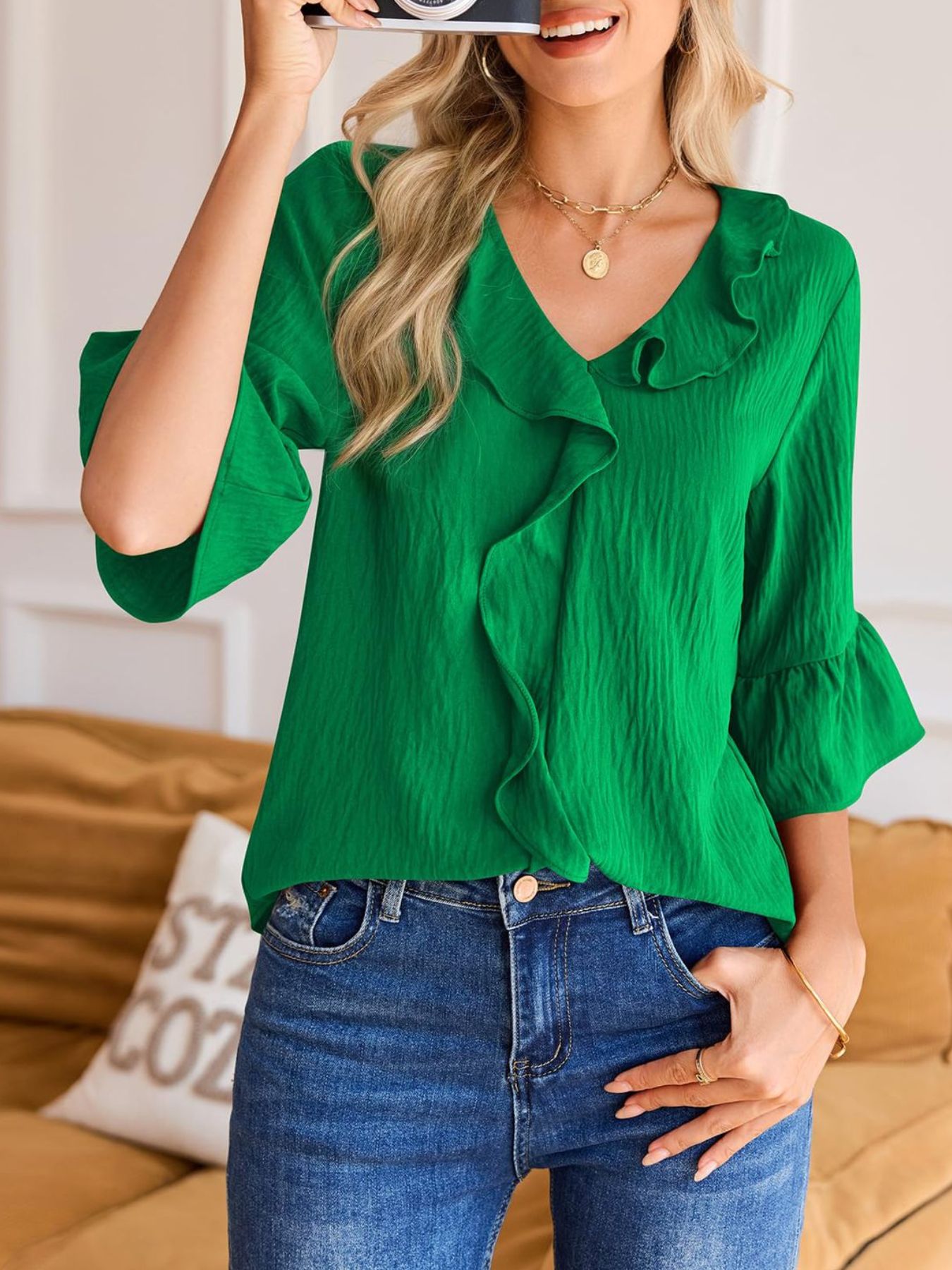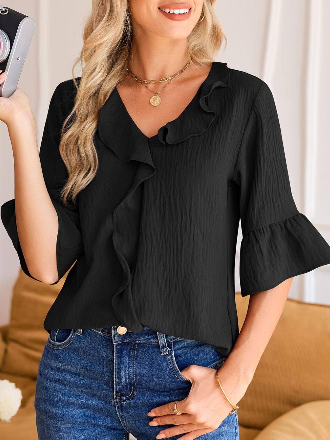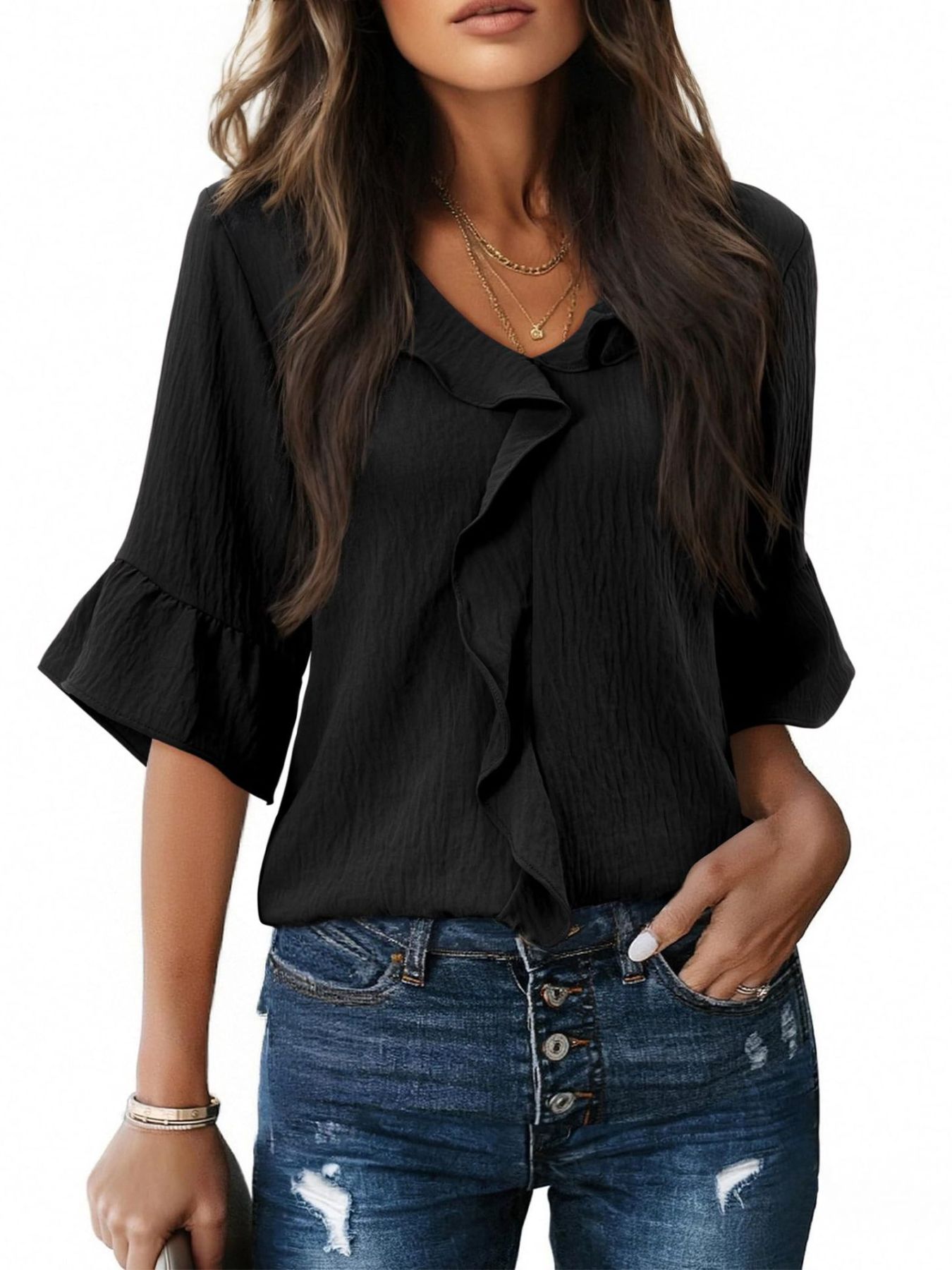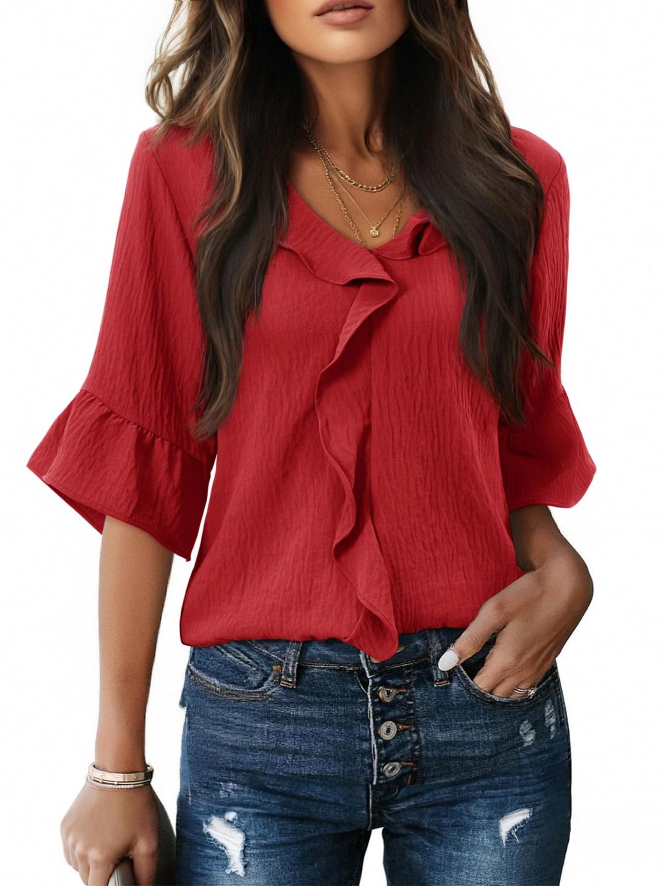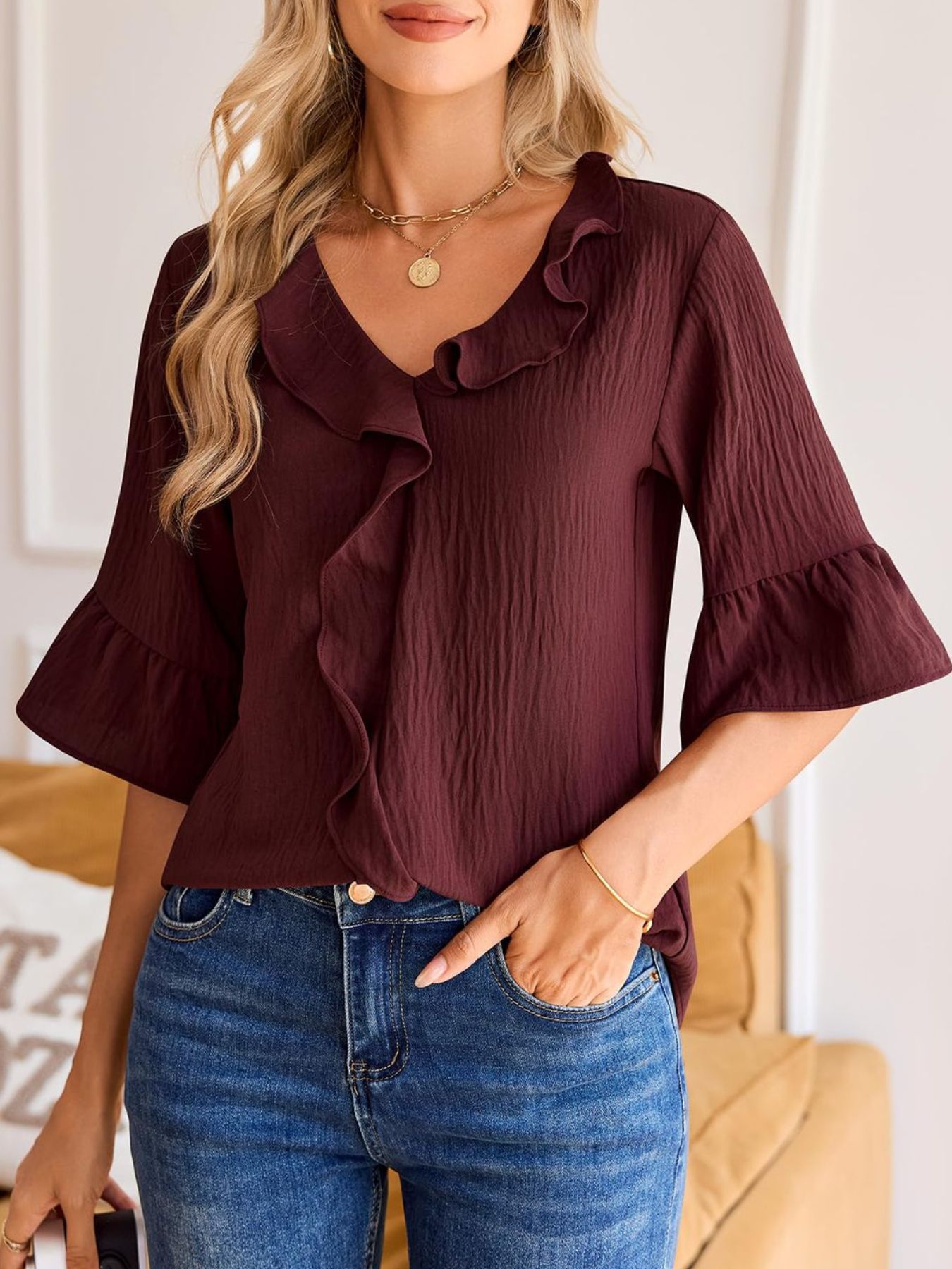 Ruffle V-Neck Flounce Sleeve Blouse