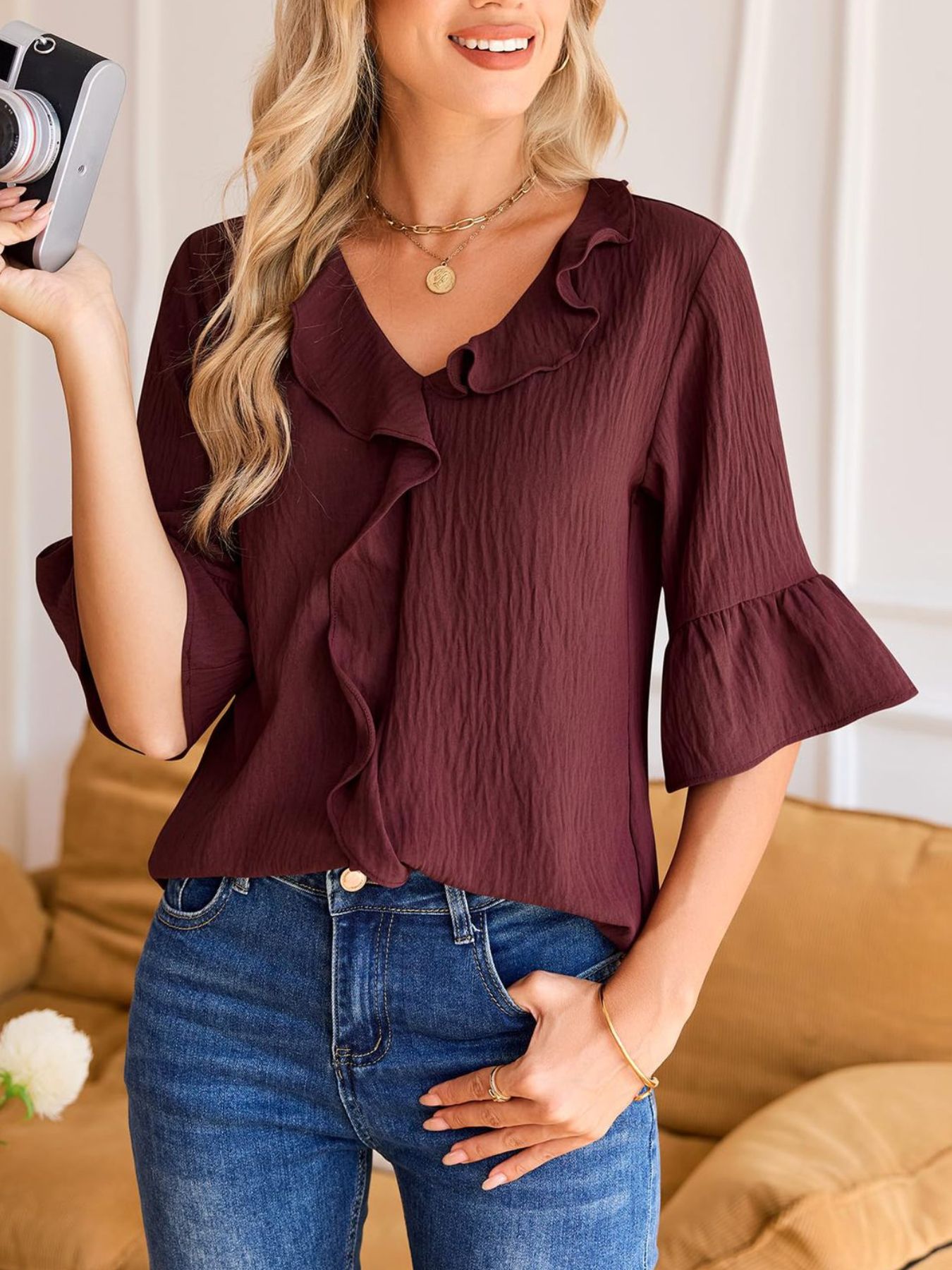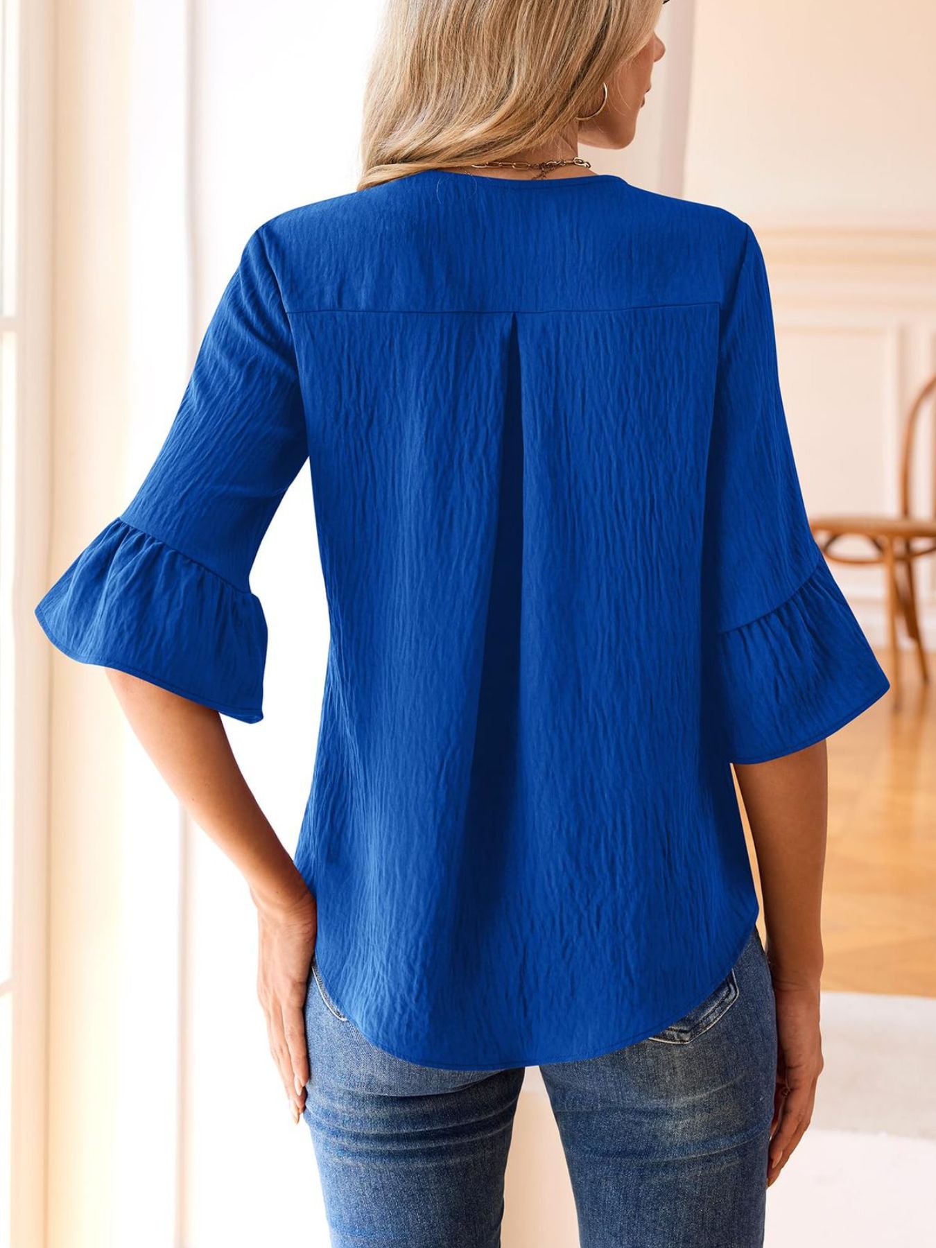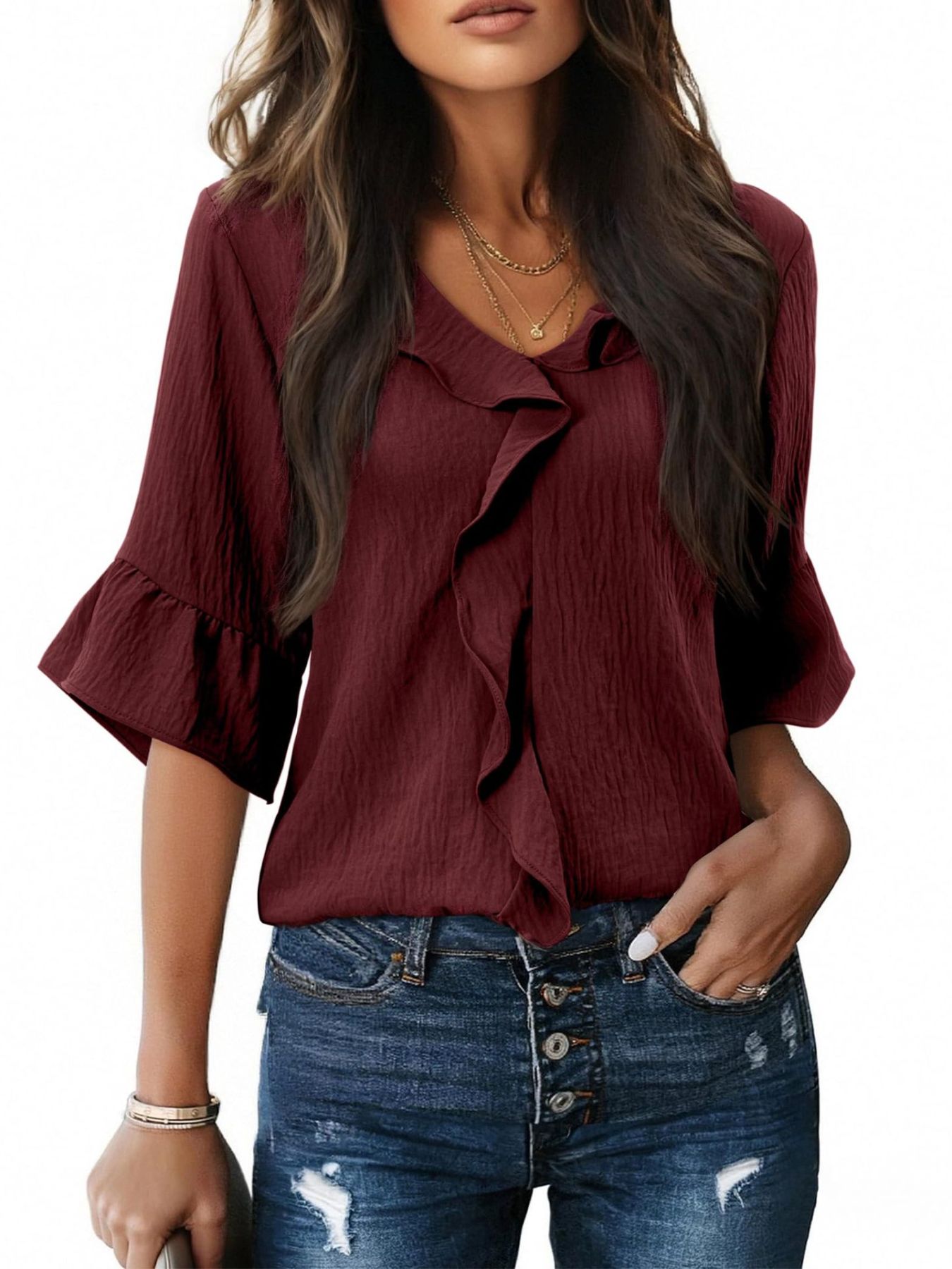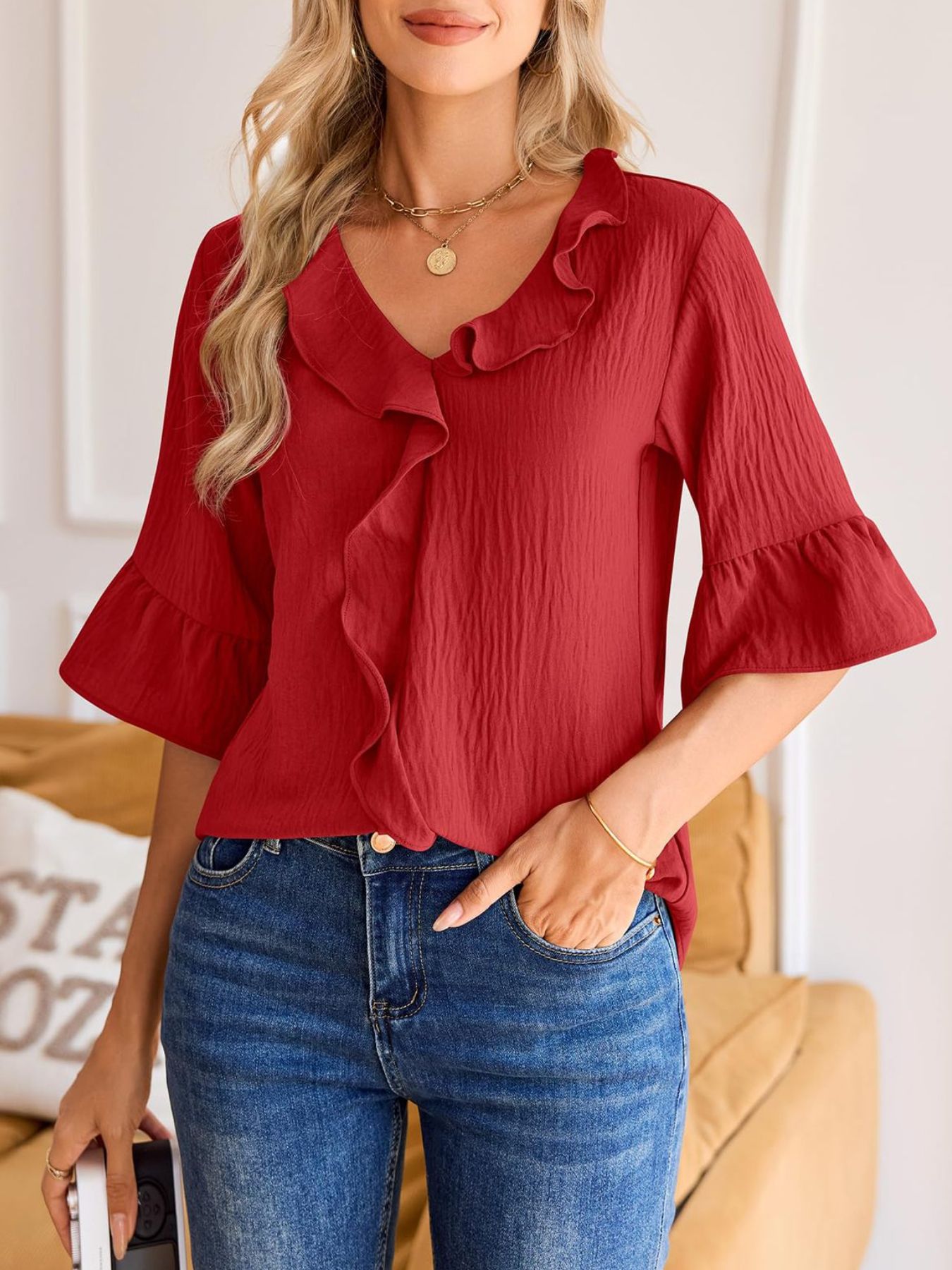 Ruffle V-Neck Flounce Sleeve Blouse