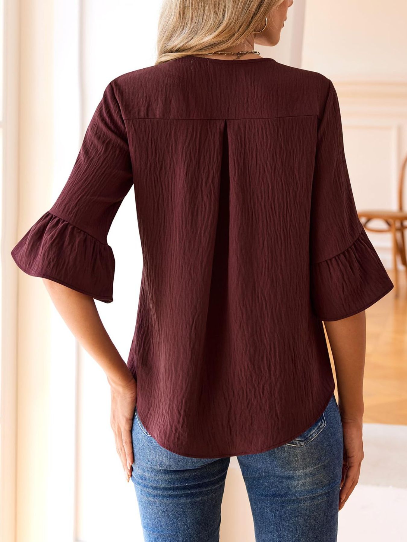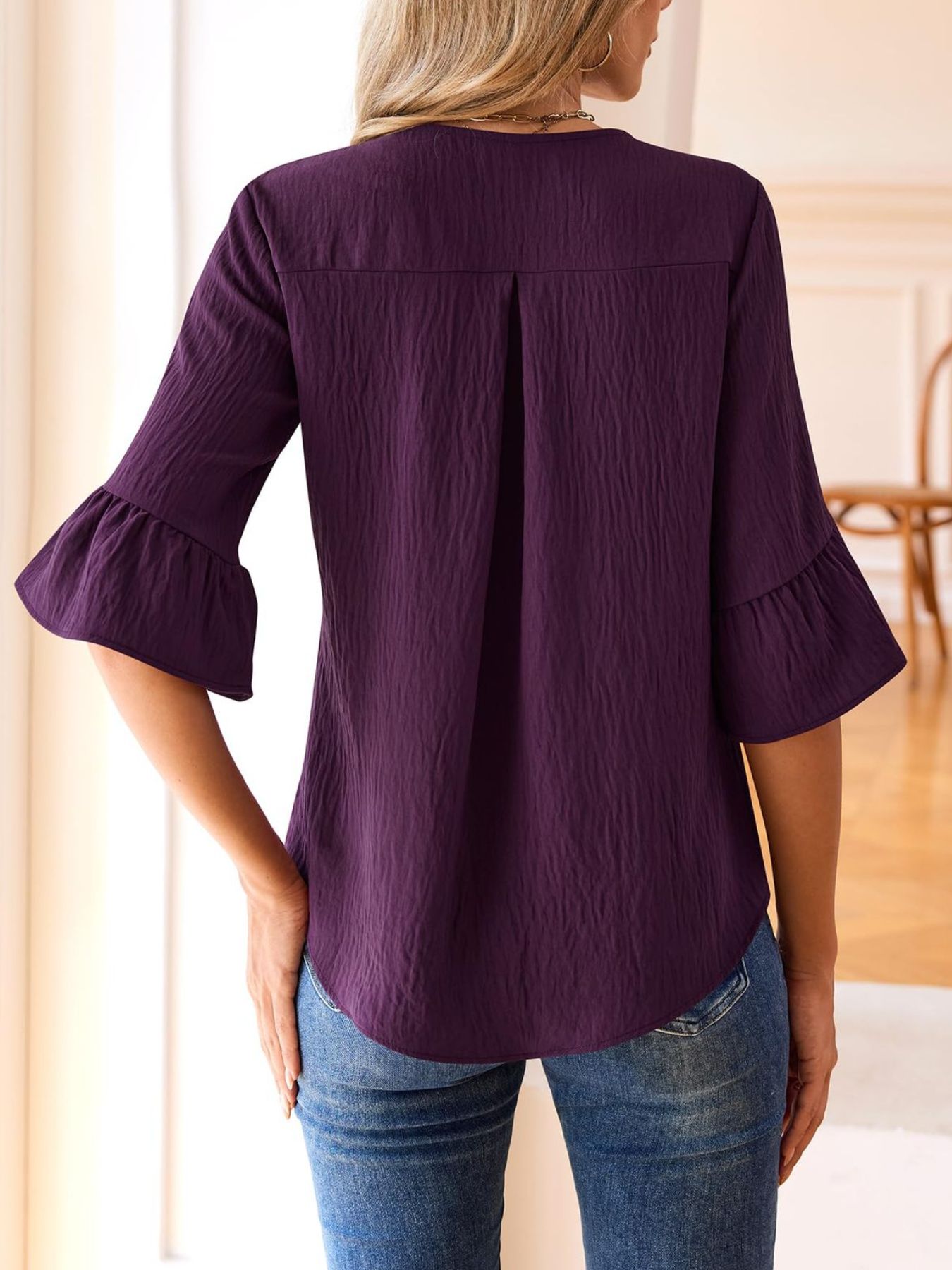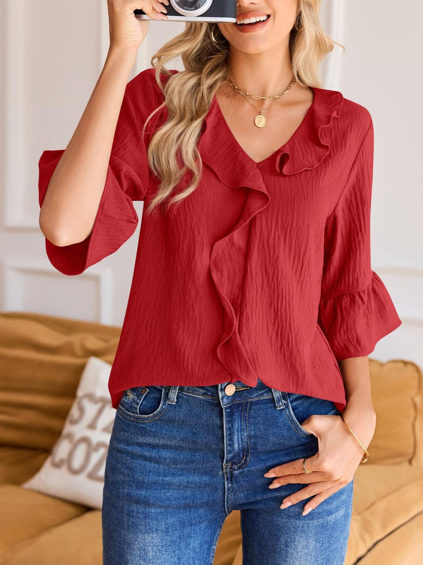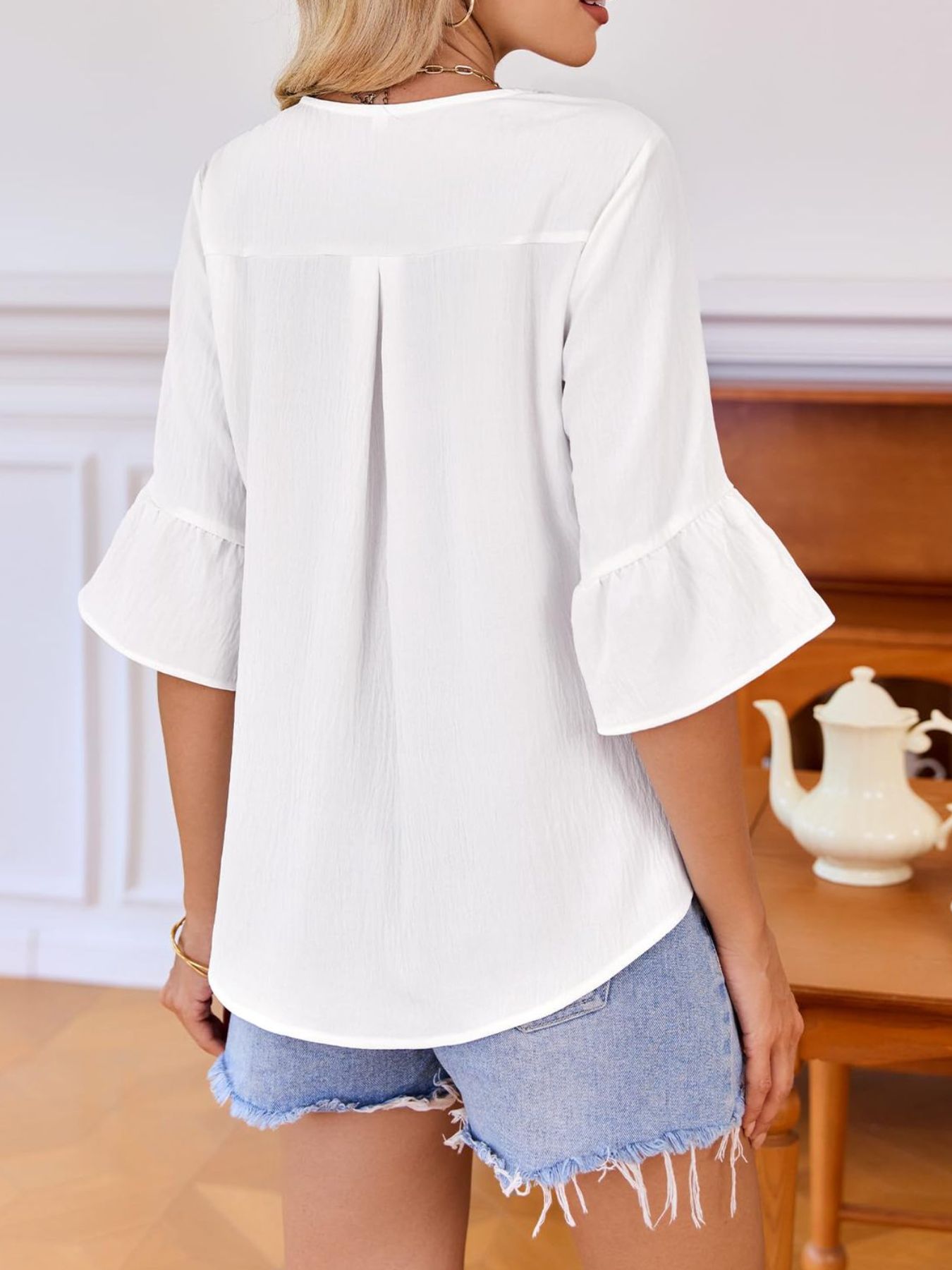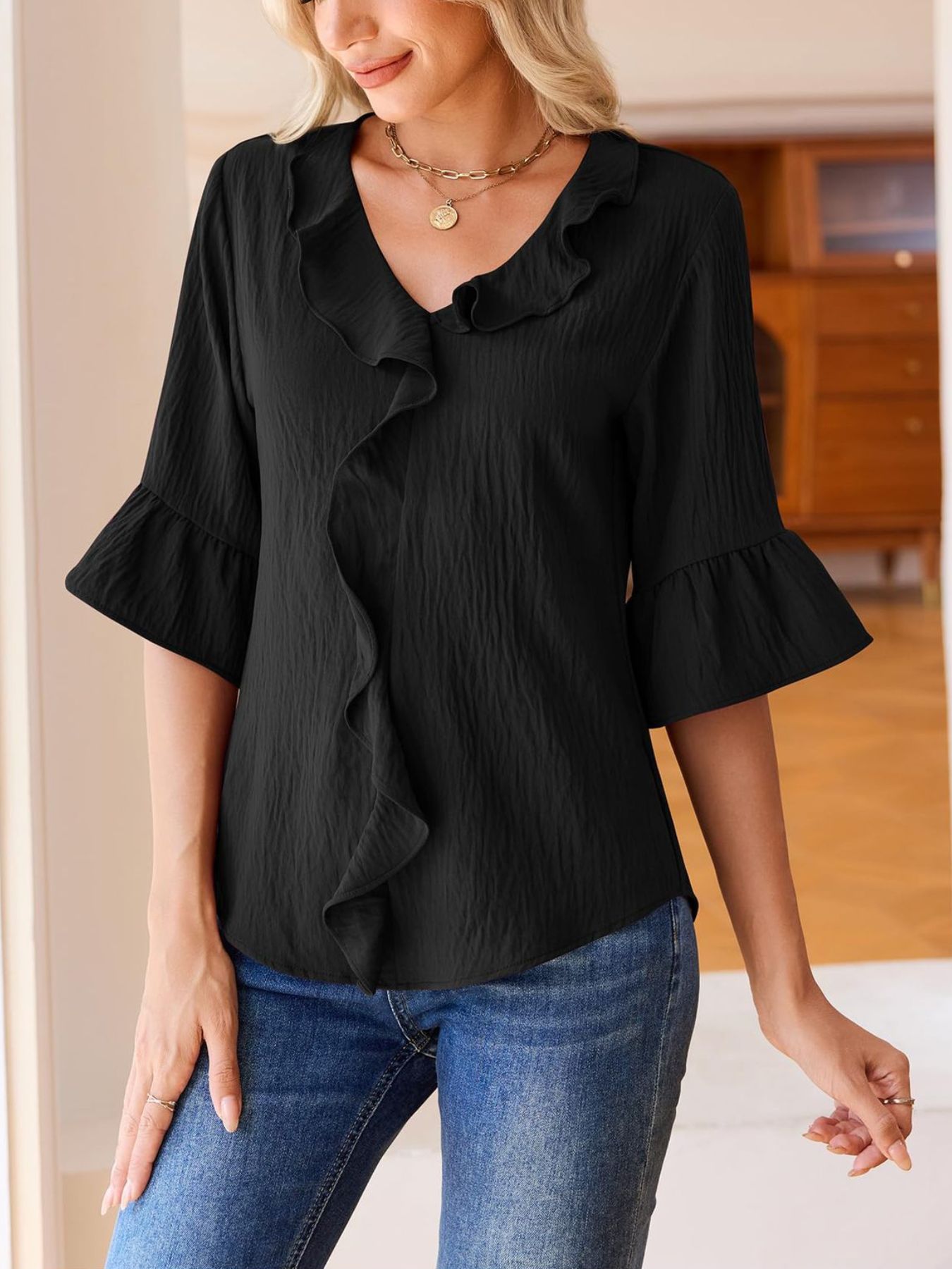 Ruffle V-Neck Flounce Sleeve Blouse