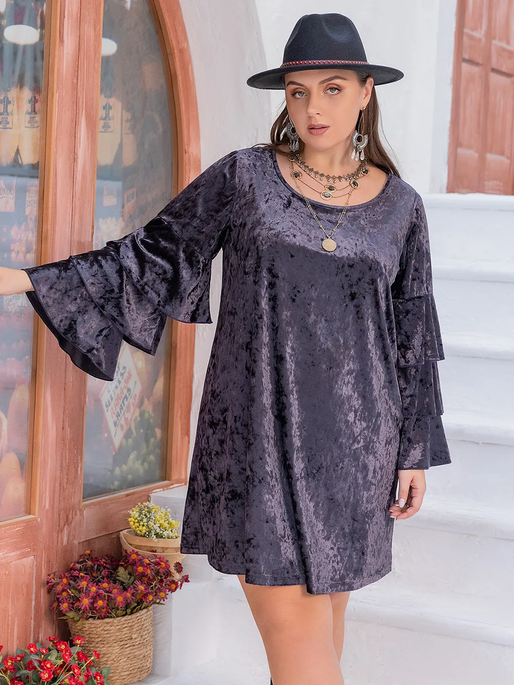 Plus Size Round Neck Flounce Sleeve Mini Dress
