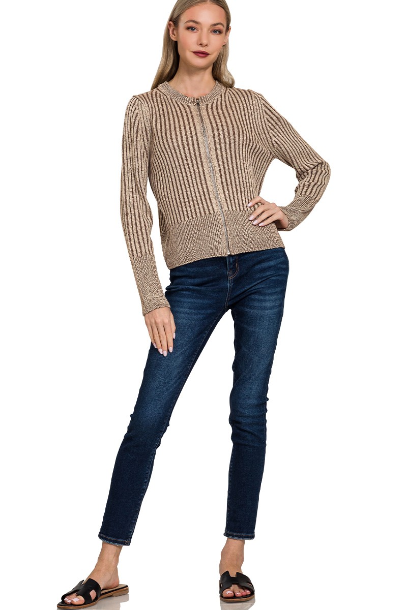 Zenana Ribbed Two Tone Zip Up Sweater Cardigan