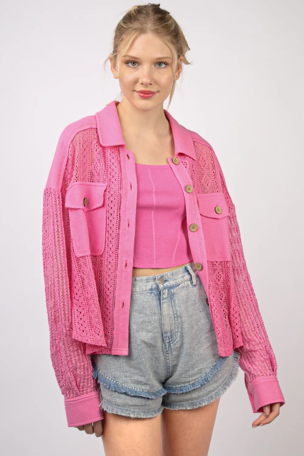 Very J Button Up Long Sleeve Lace Shirt