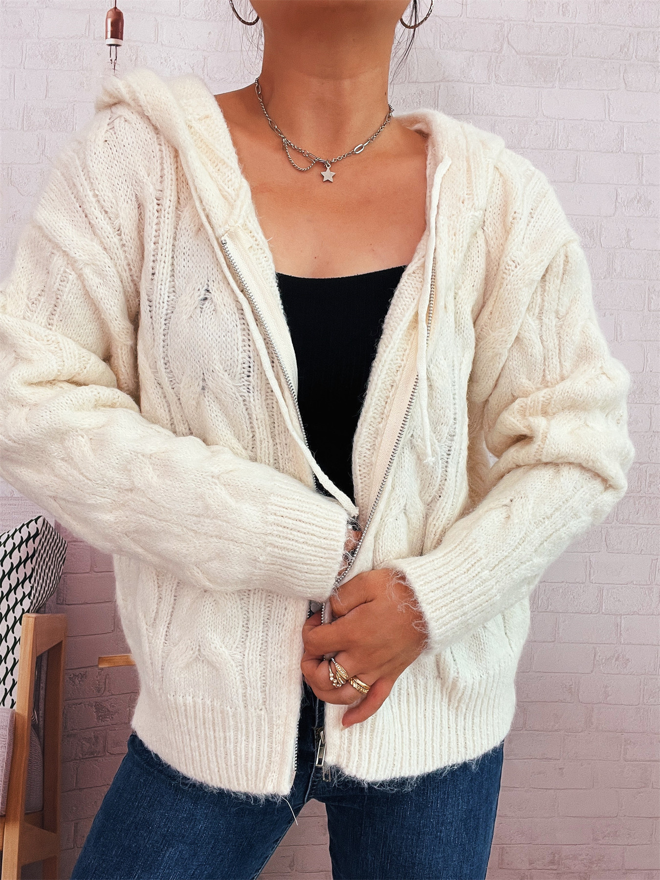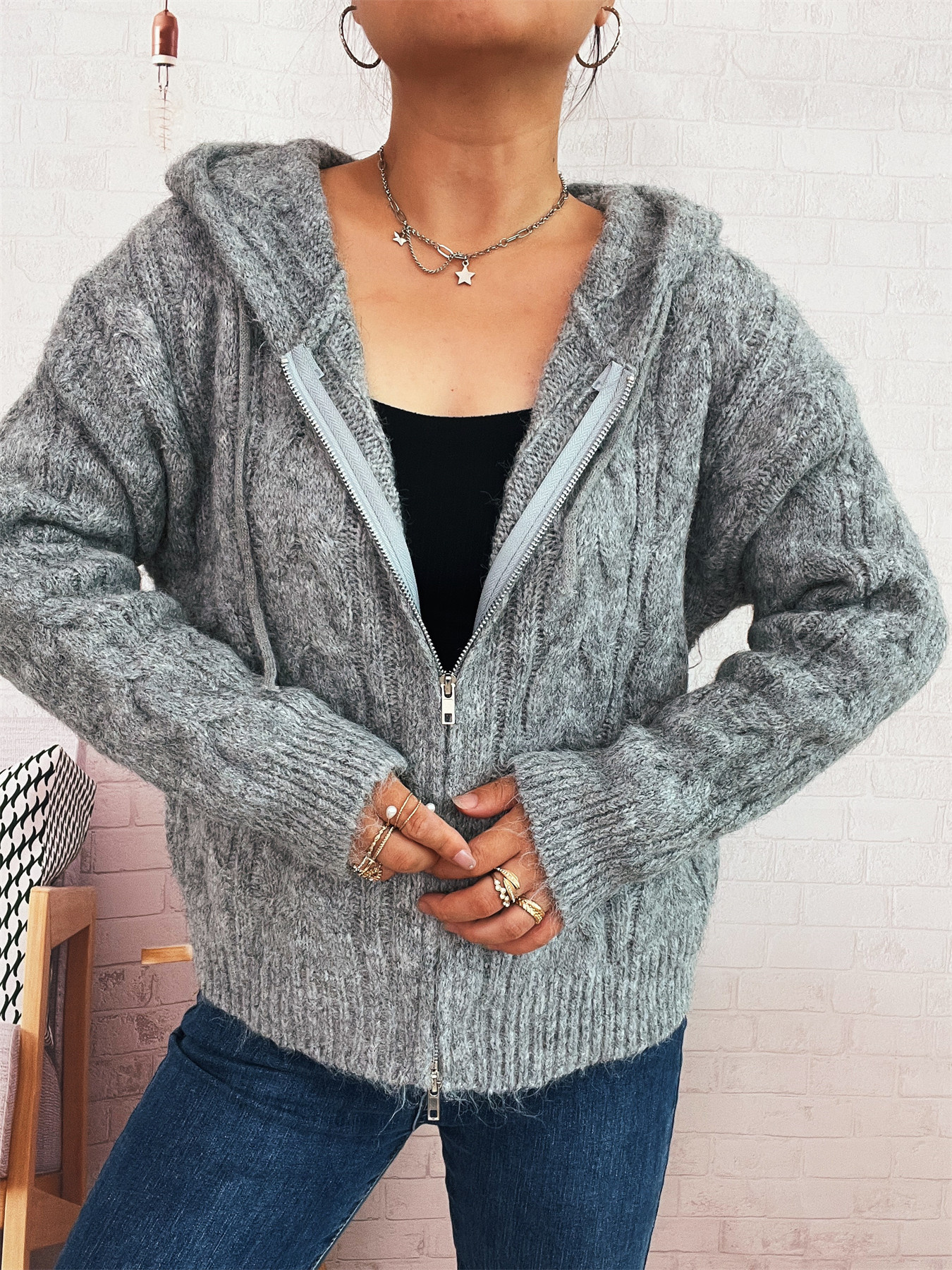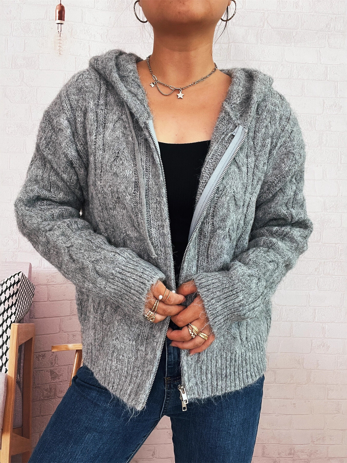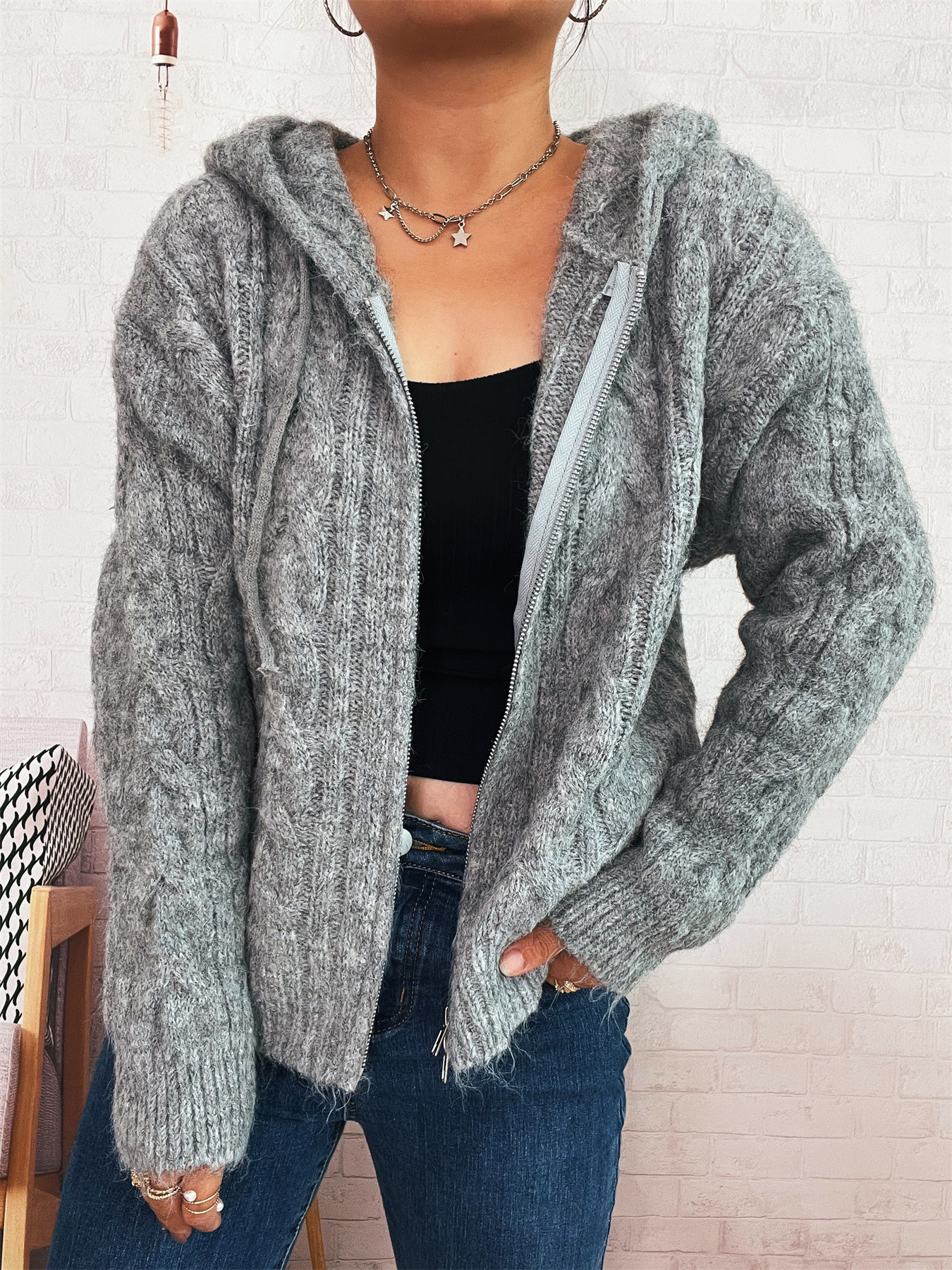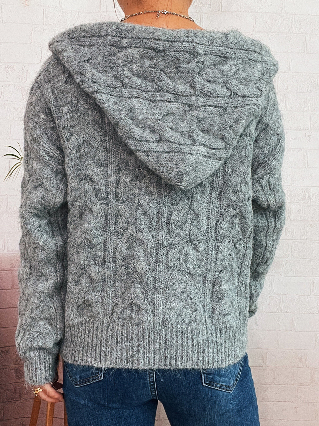 Cable Knit Hooded Zip-Up Cardigan