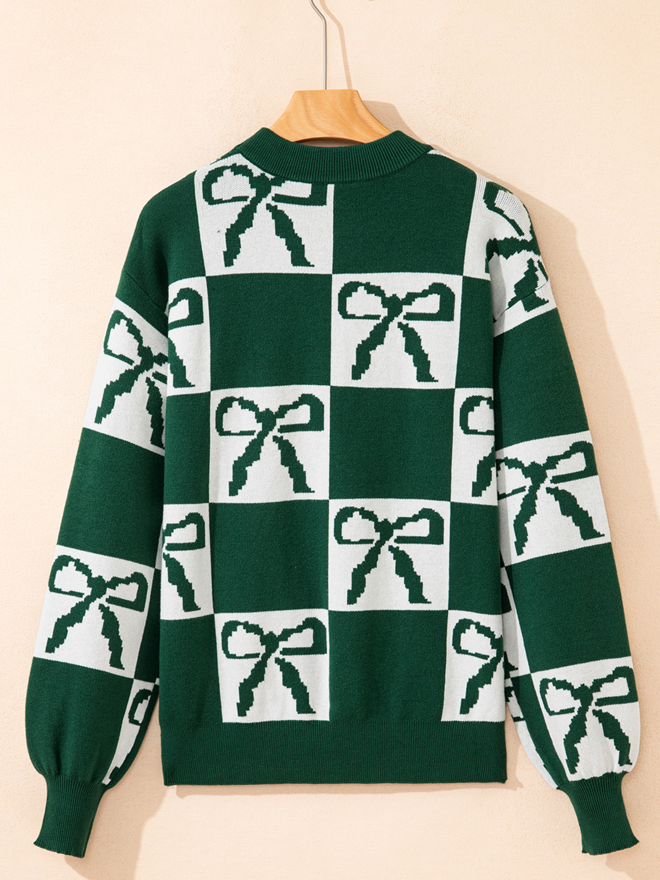 Checkered Bow Round Neck Casual Sweater