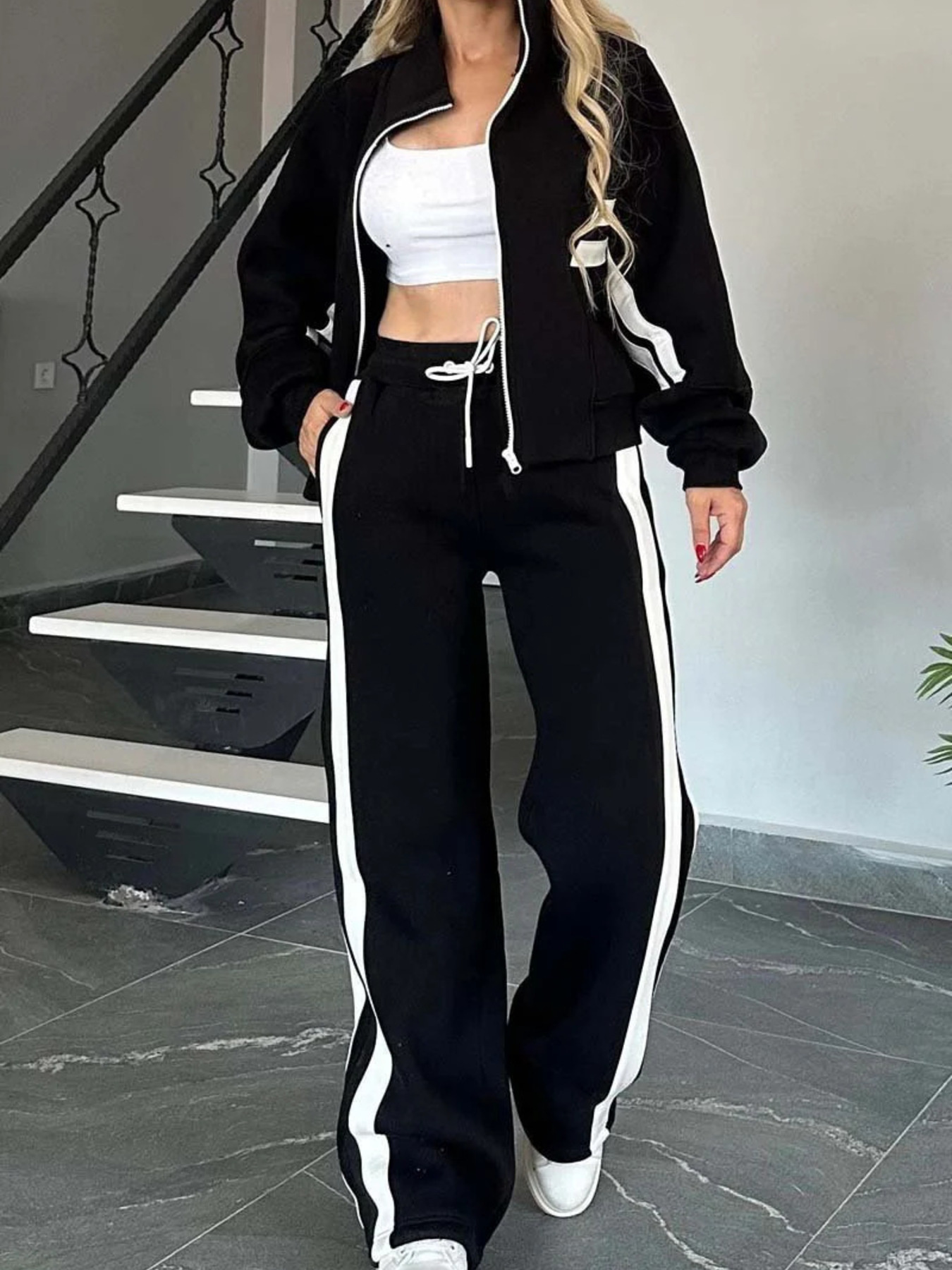Full Size Contrast Stripe Zip Up Jacket And Pants Set Plus Size