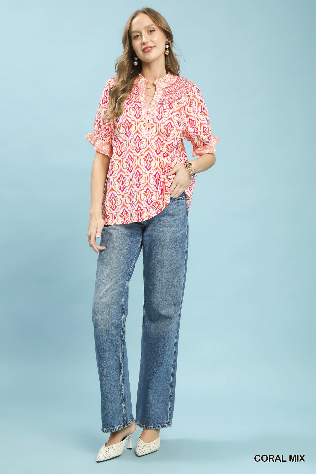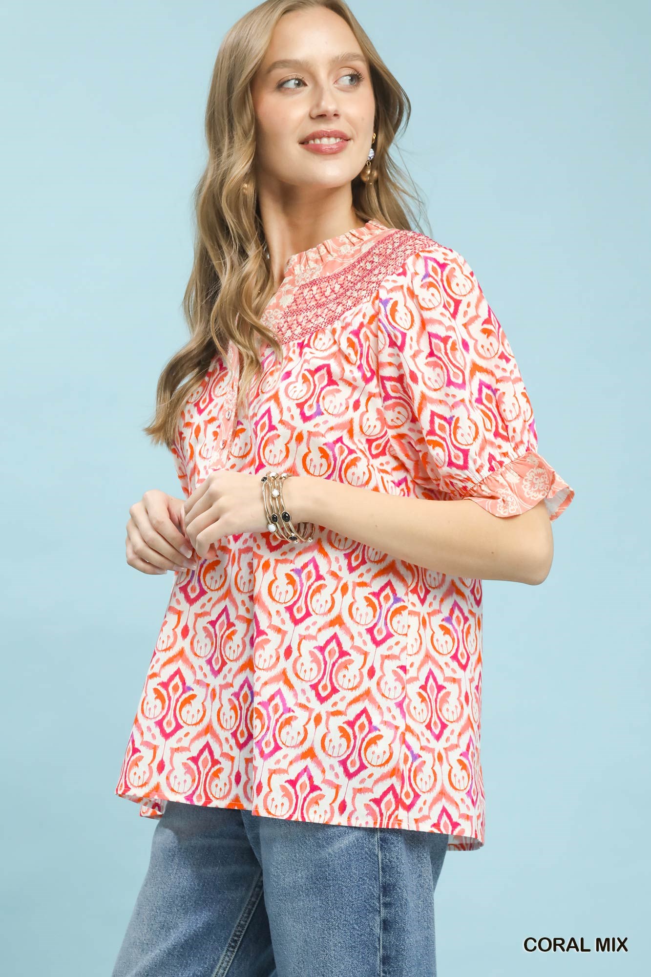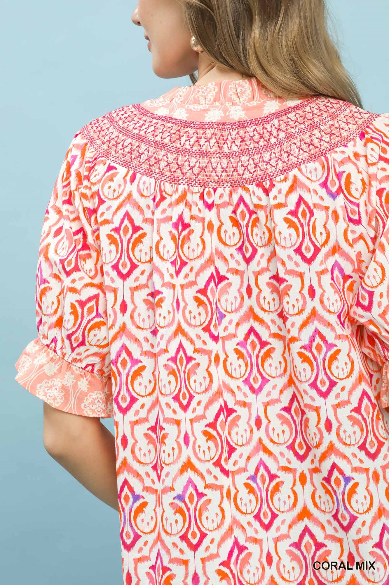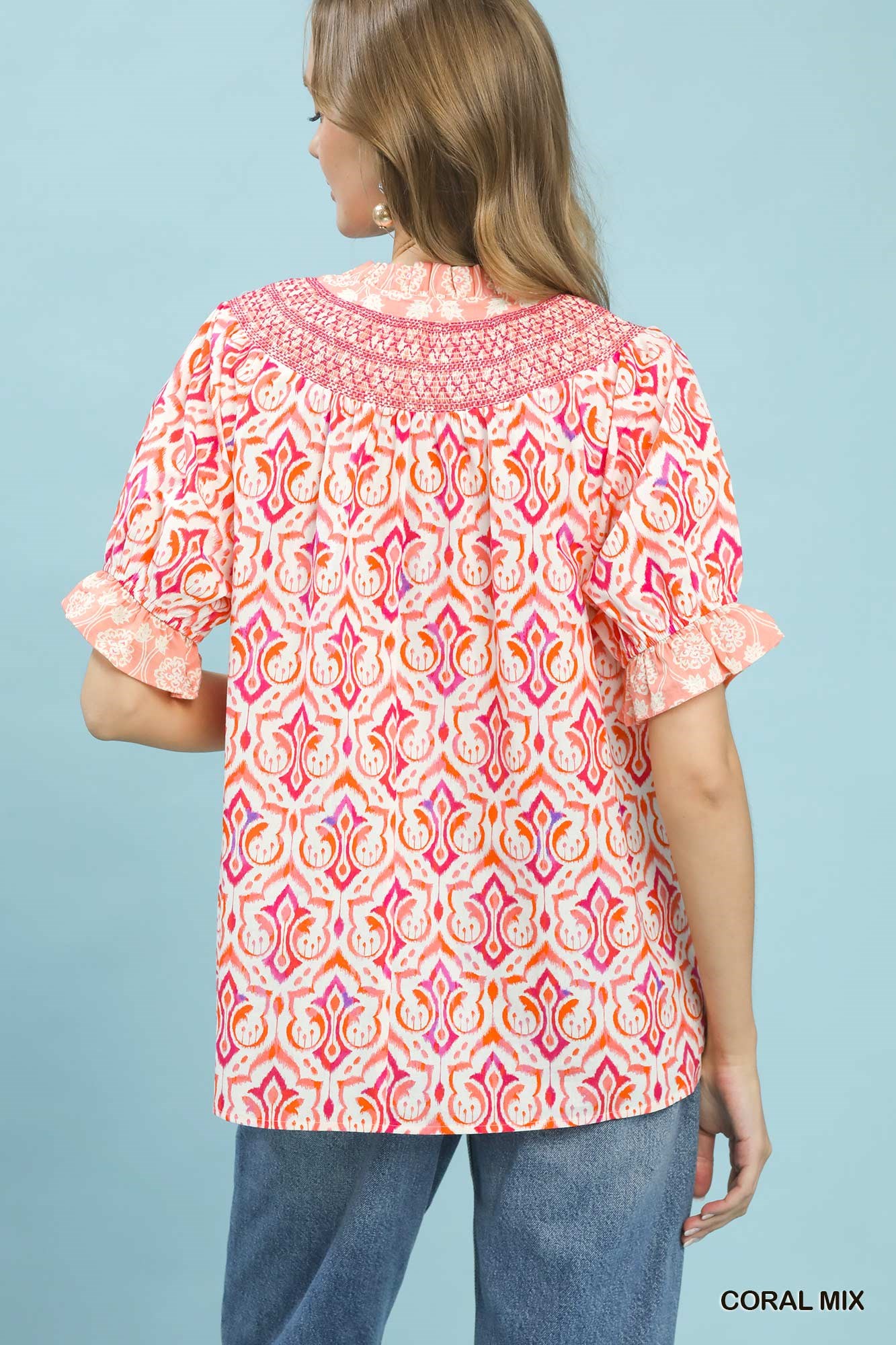 Umgee Mix Boho Puff Sleeve Smocked Top