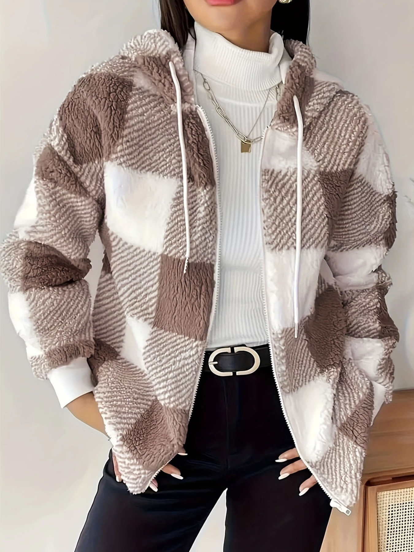 Drawstring Plaid Sherpa Zip-Up Hoodie