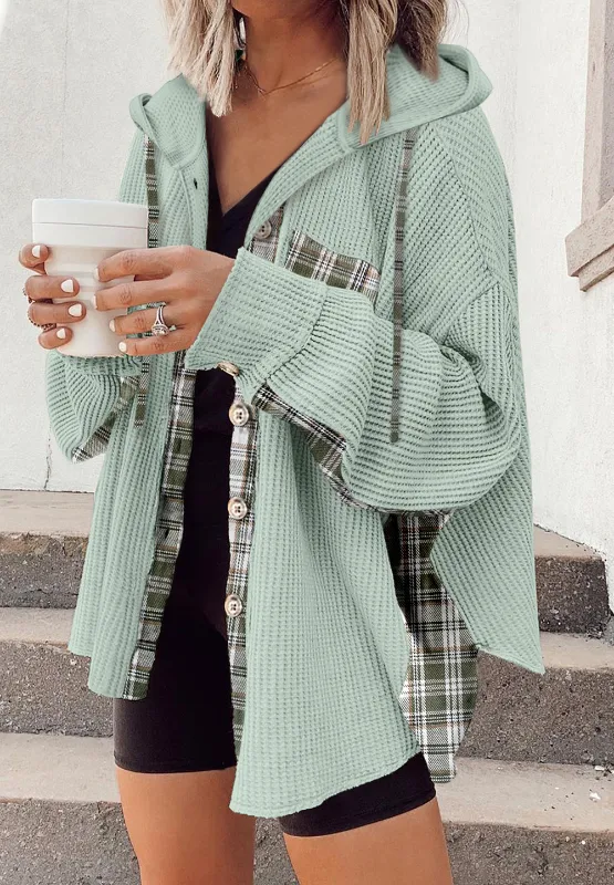 Waffle Knit Plaid Patchwork Drawstring Hooded Shacket