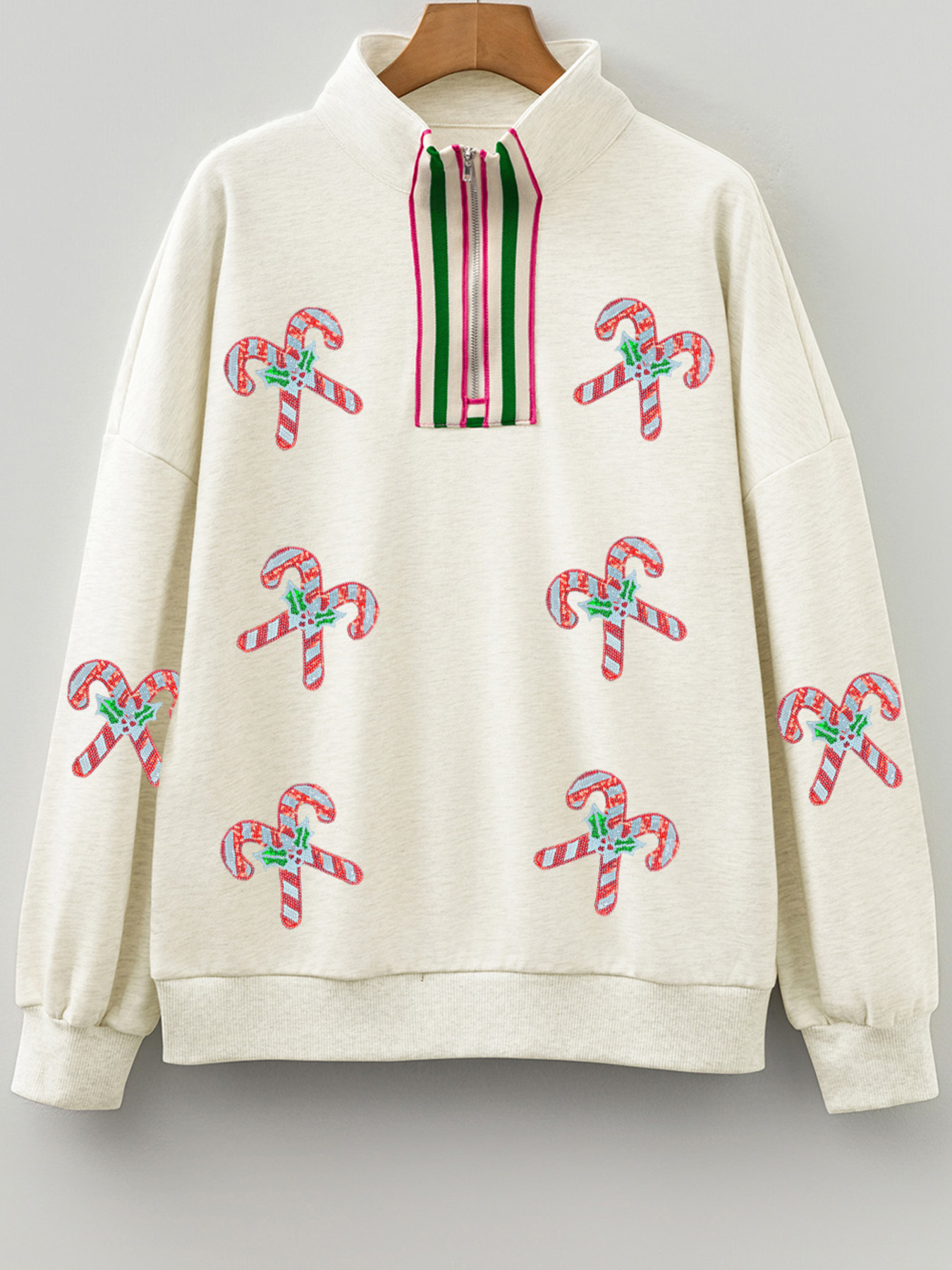 Sequin Candy Canes Contrast Collar Patchwork Loose Sweatshirt