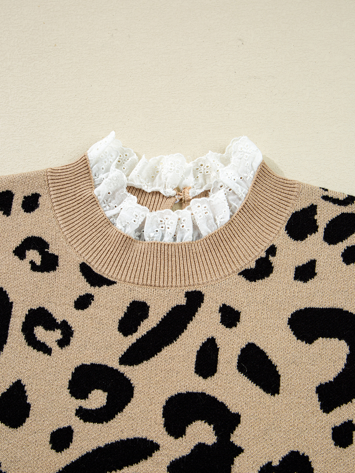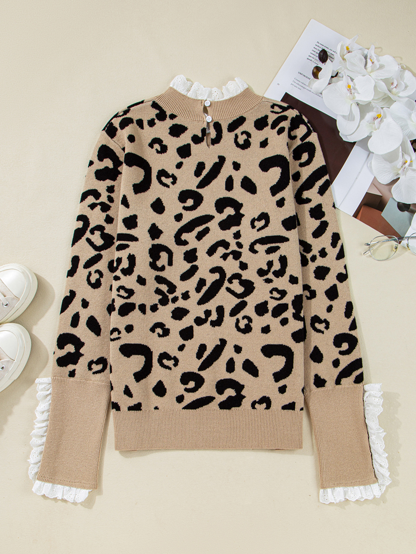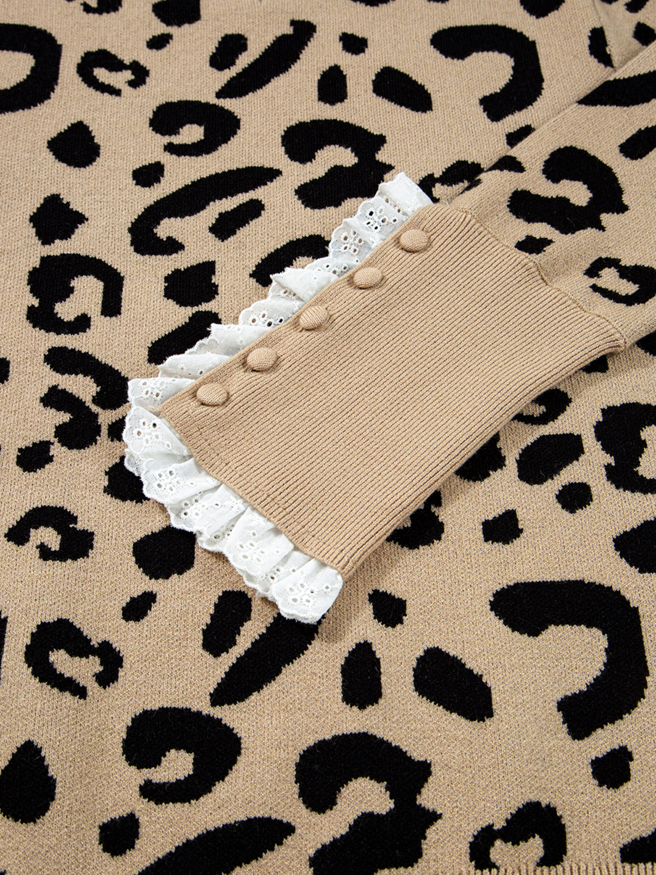 Leopard Pattern Lace Ribbed Detail Button Cuffed Sweater