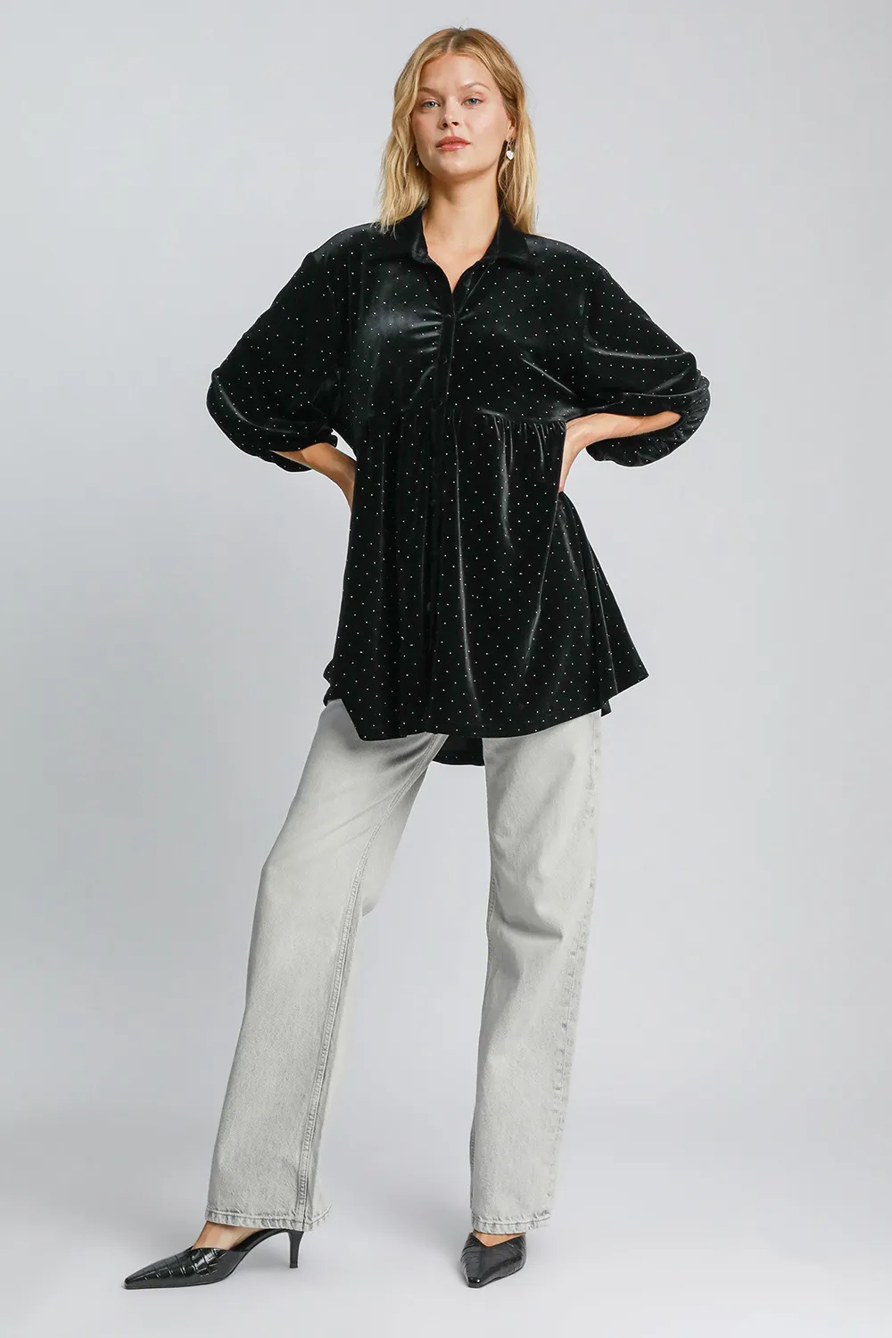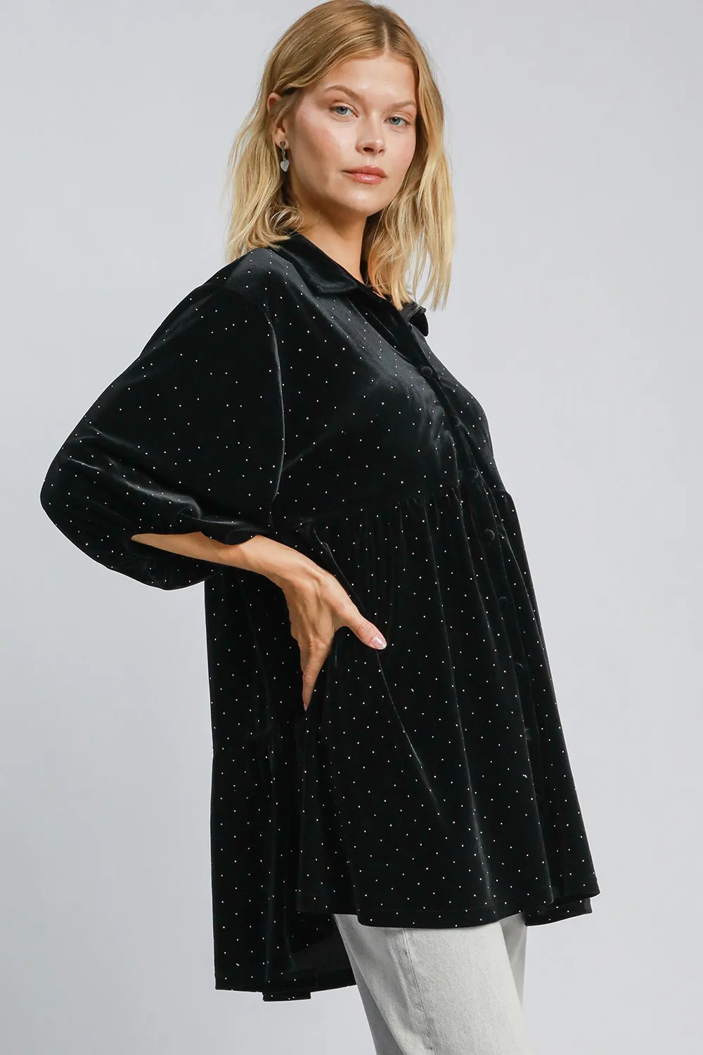 Umgee Full Size Polka Dot Button Up Half Sleeve Shirt