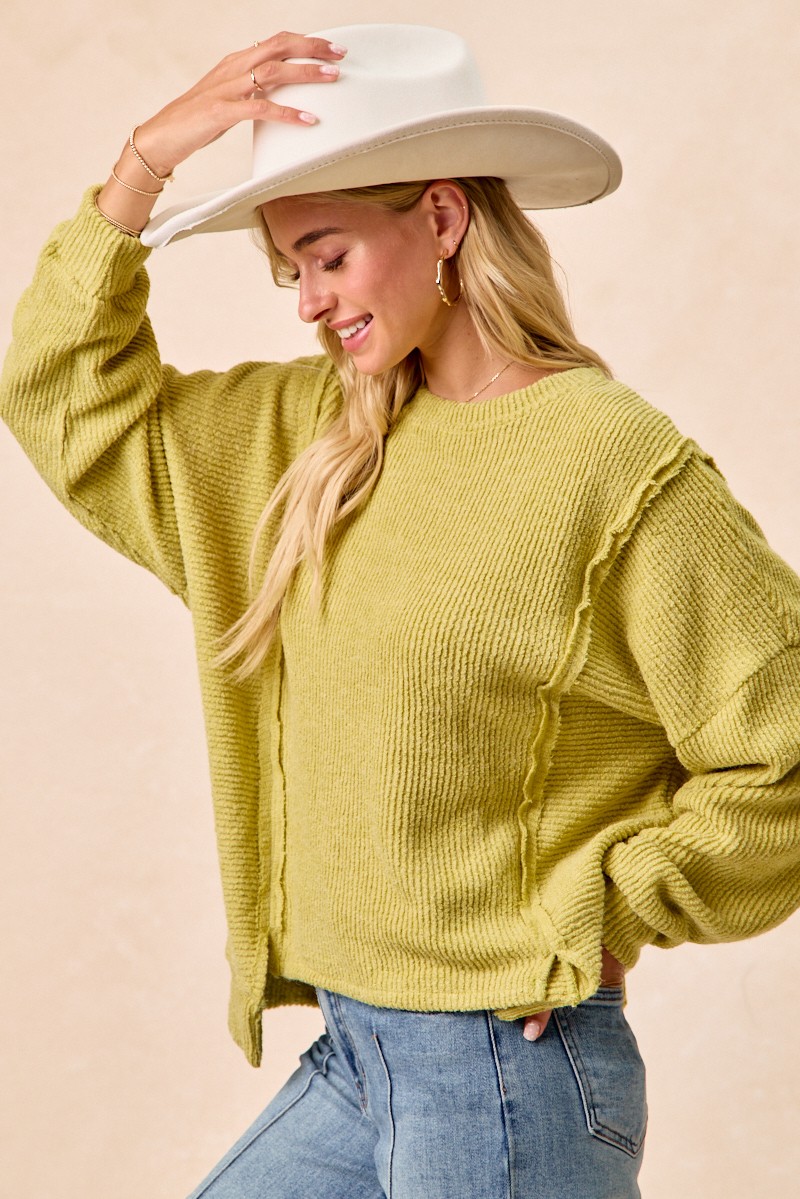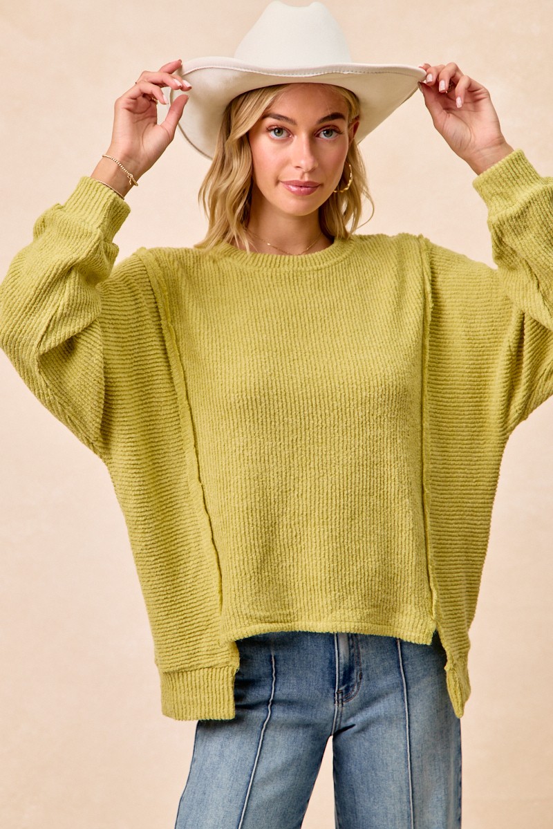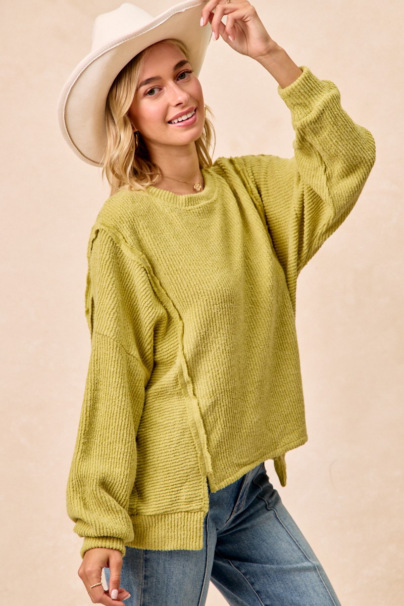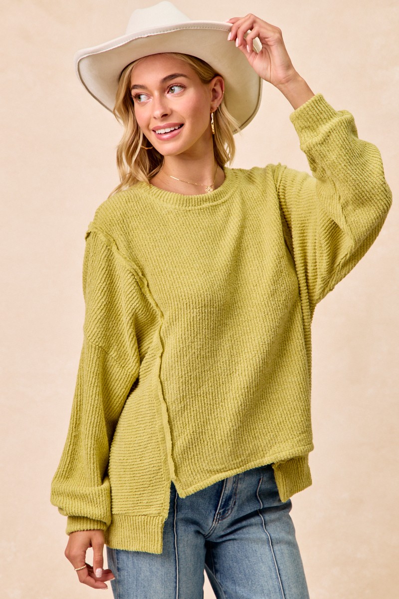 Bibi Boucle Rib Knit Uneven Hem Sweater With Open Seam