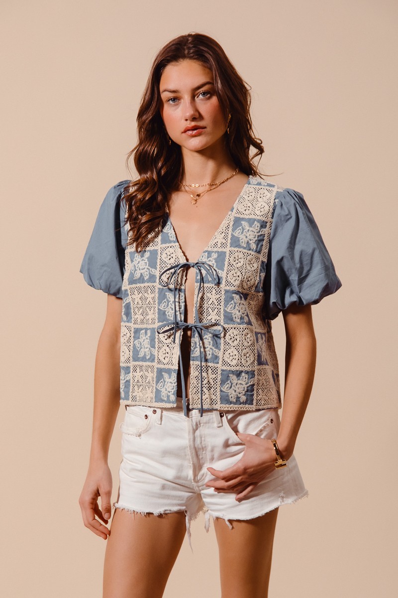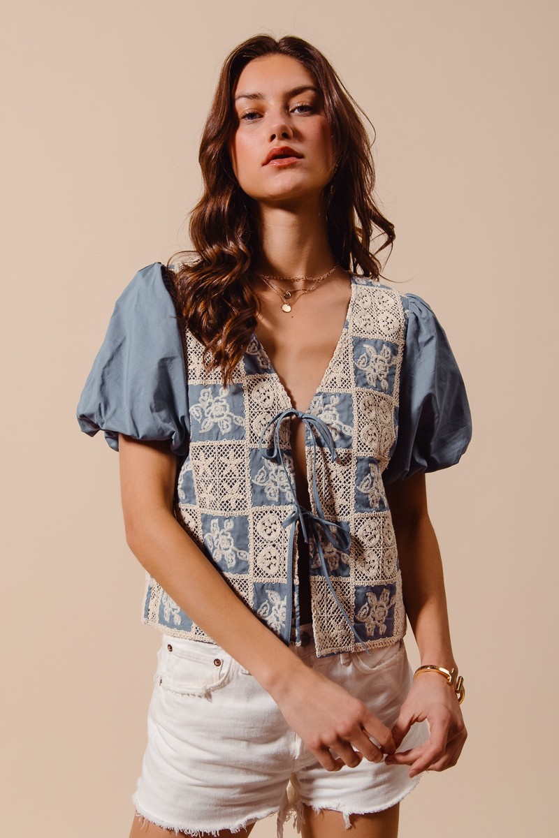So Me Crochet Lace Tie Front V Neck Blouse Top